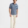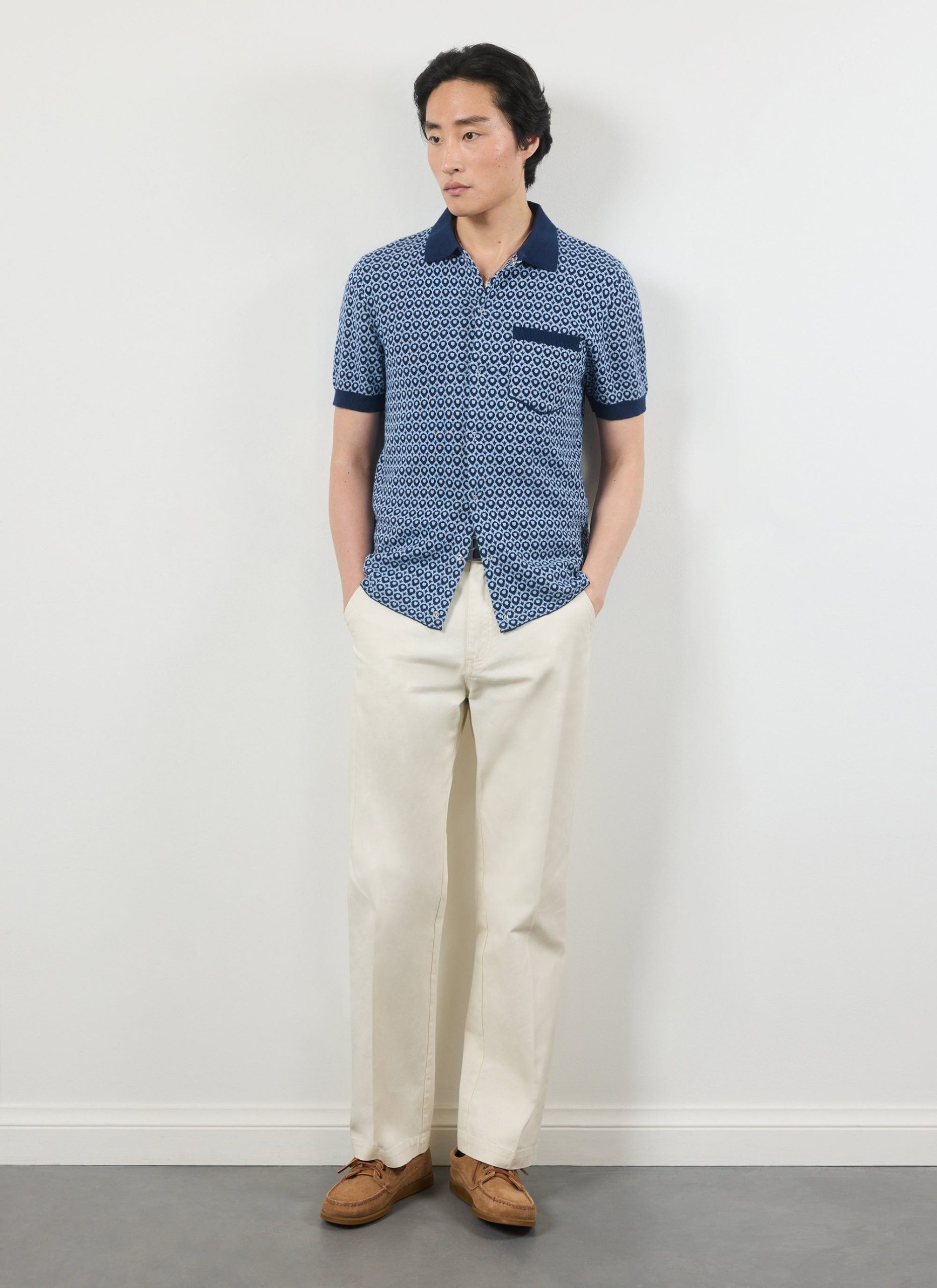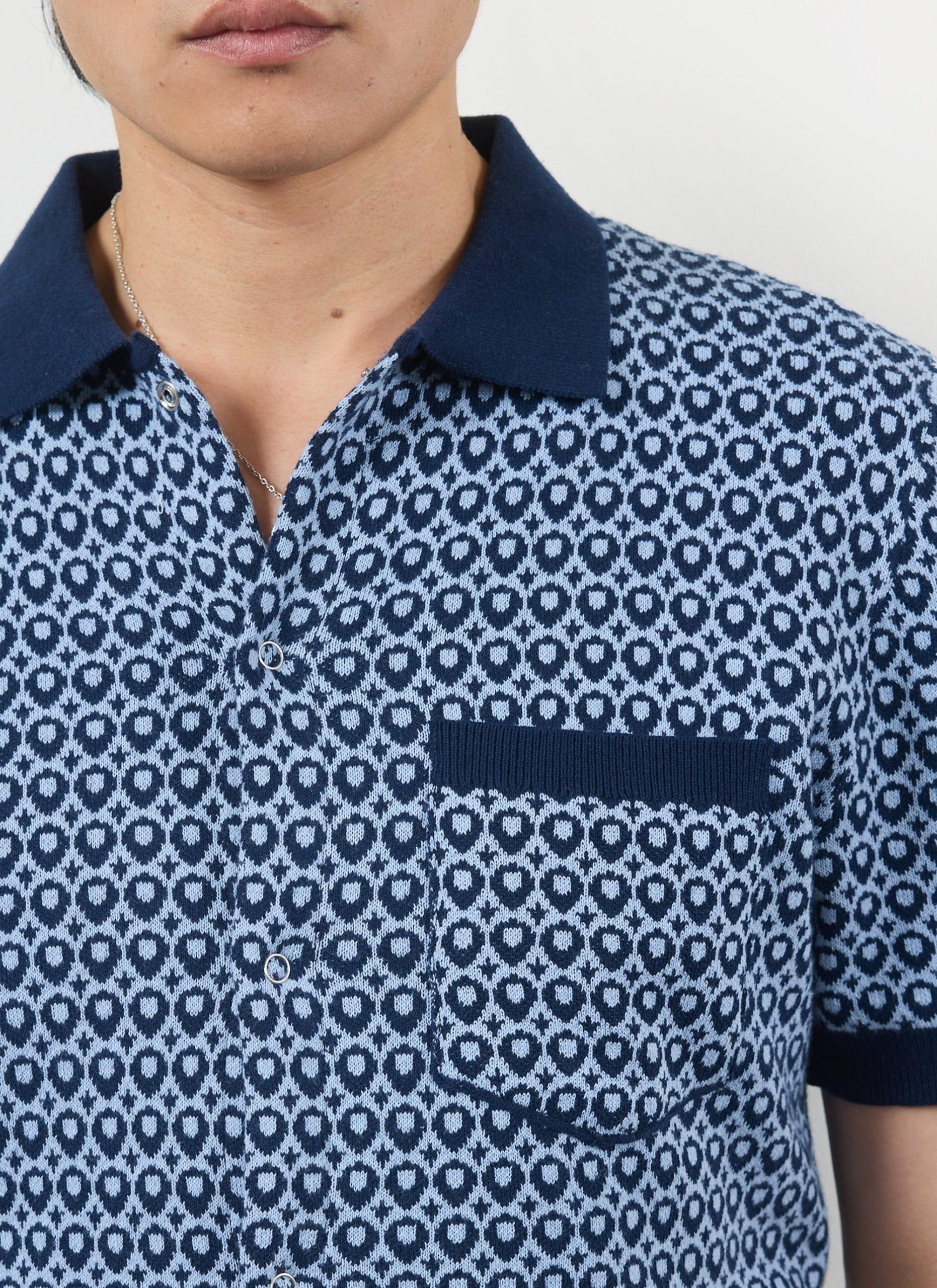 - Features: Men’s Short Sleeve Knitted Shirt in Blue Jacquard. Crafted for style and comfort, this patterned shirt features a classic regular fit and detailed with snap buttons, a front chest pocket, and refined ribbed trims on the collar and sleeves. Designed to hold its shape while feeling soft on the skin, this men’s knitwear shirt offers year round wearability. The versatile Casa Picante can be easily layered or worn on its own, pairing effortlessly with any style of trousers for an elevated, everyday look.