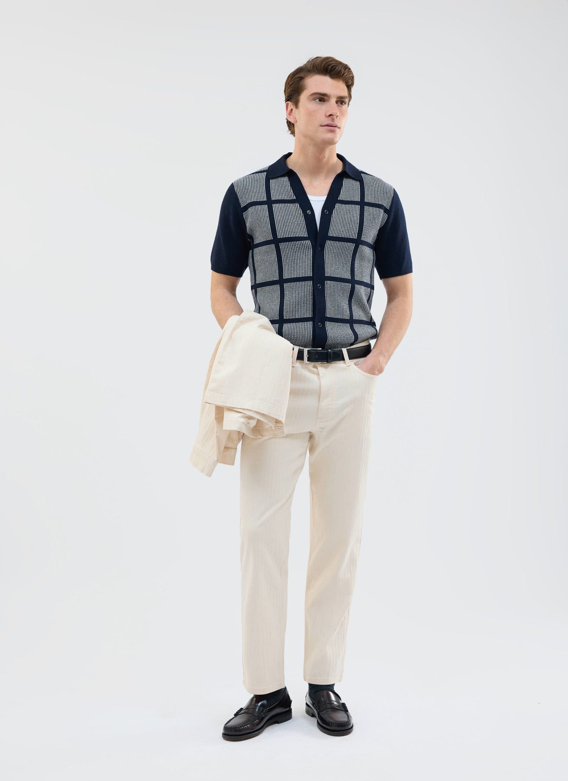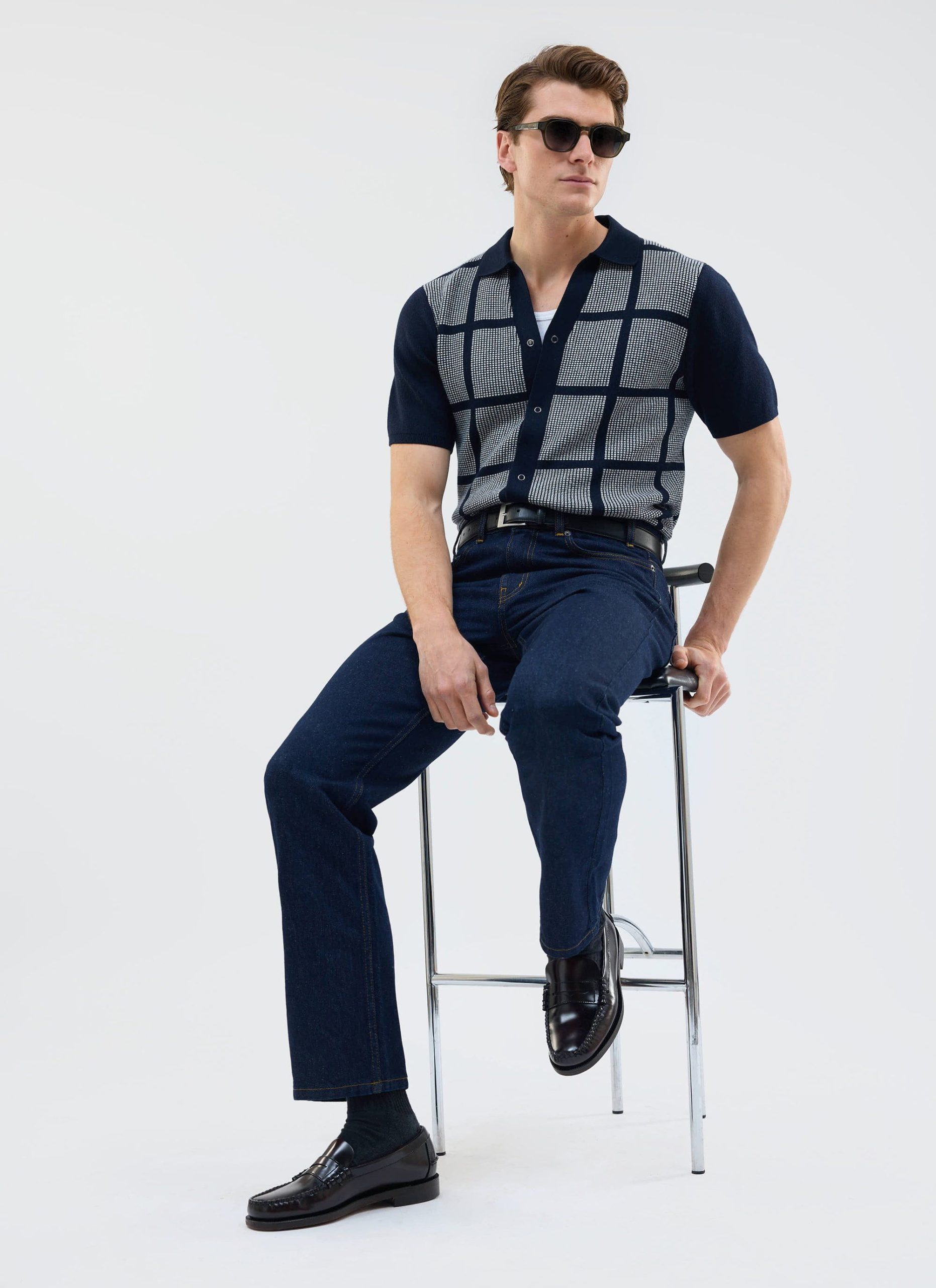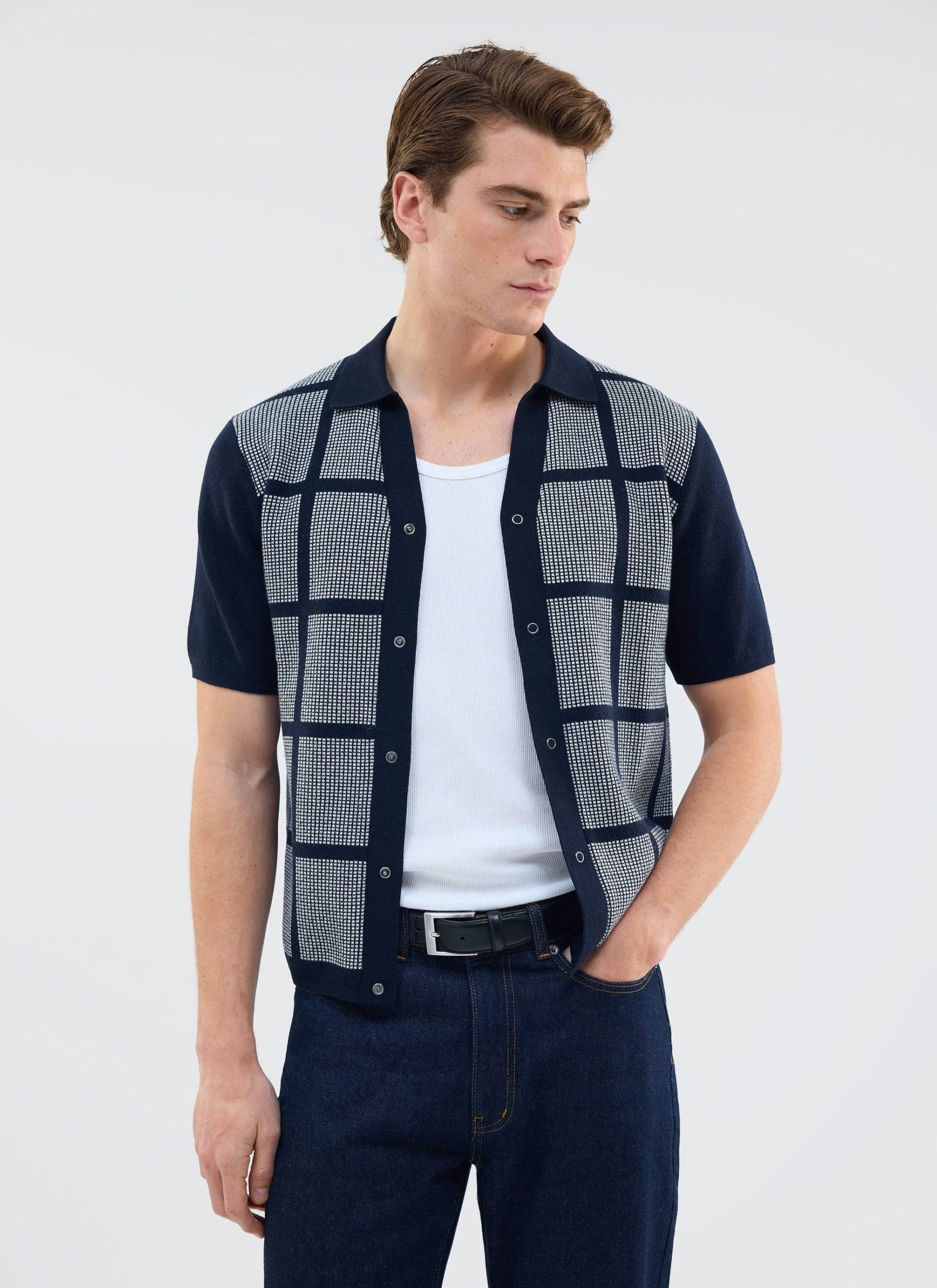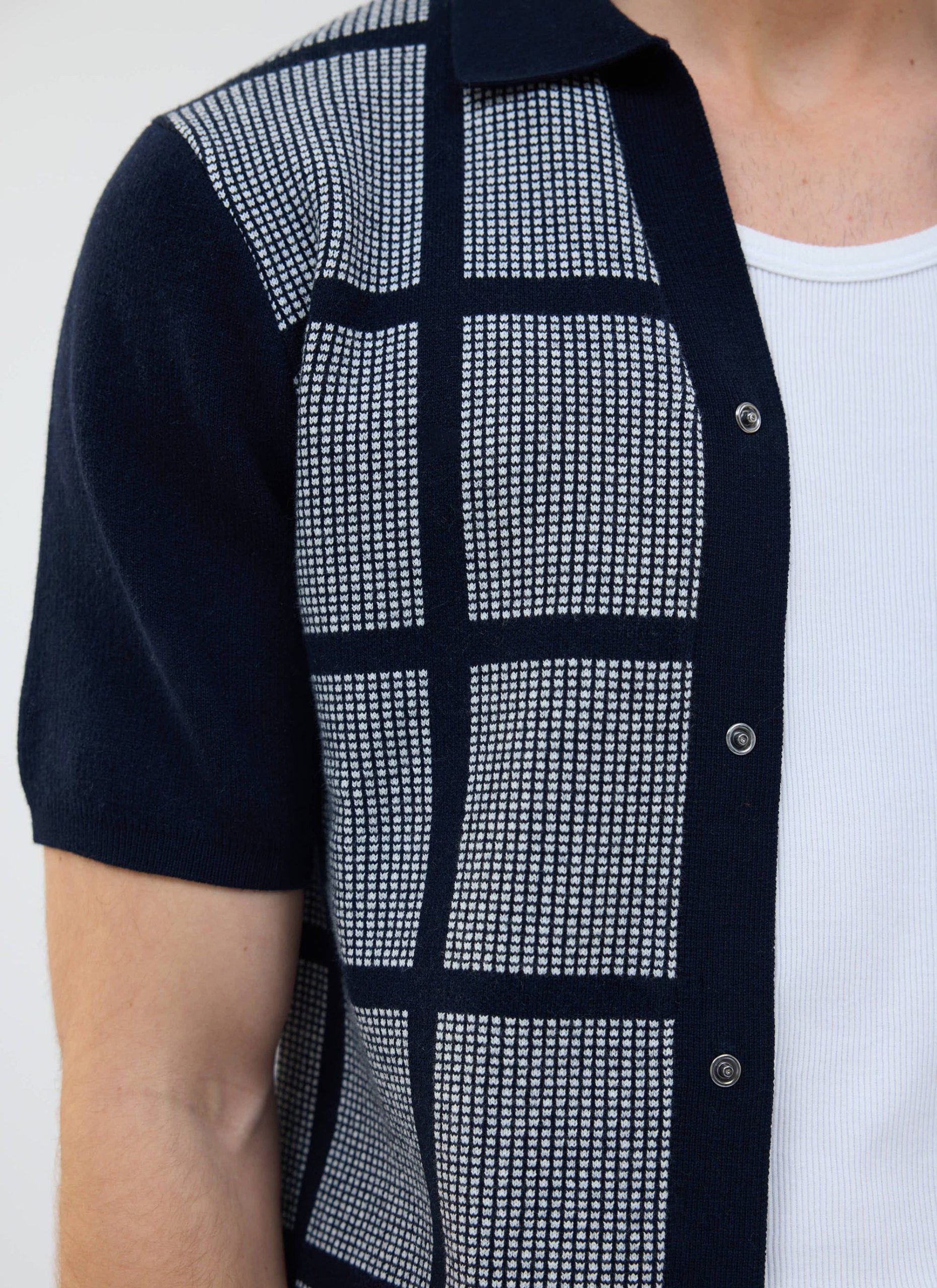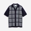 - Features: Men’s open collar knitted shirt, crafted from a breathable cotton and merino blend for all-day comfort. This navy bowling shirt features a retro inspired square design and stylish snap buttons, allowing it to be worn open or closed. It pairs effortlessly with Percival denim or suiting options, making it a smart-casual staple that’s perfect for summer.