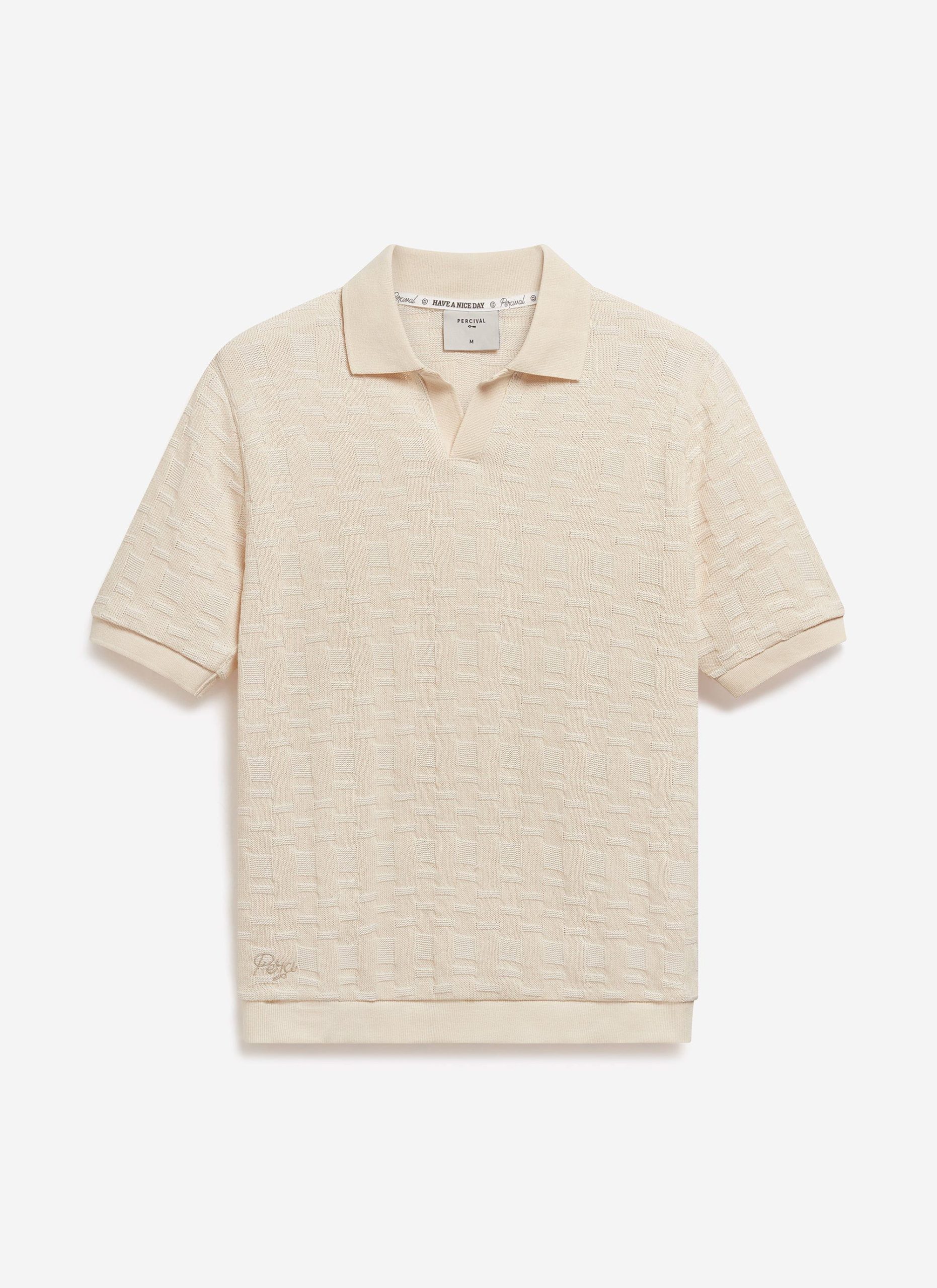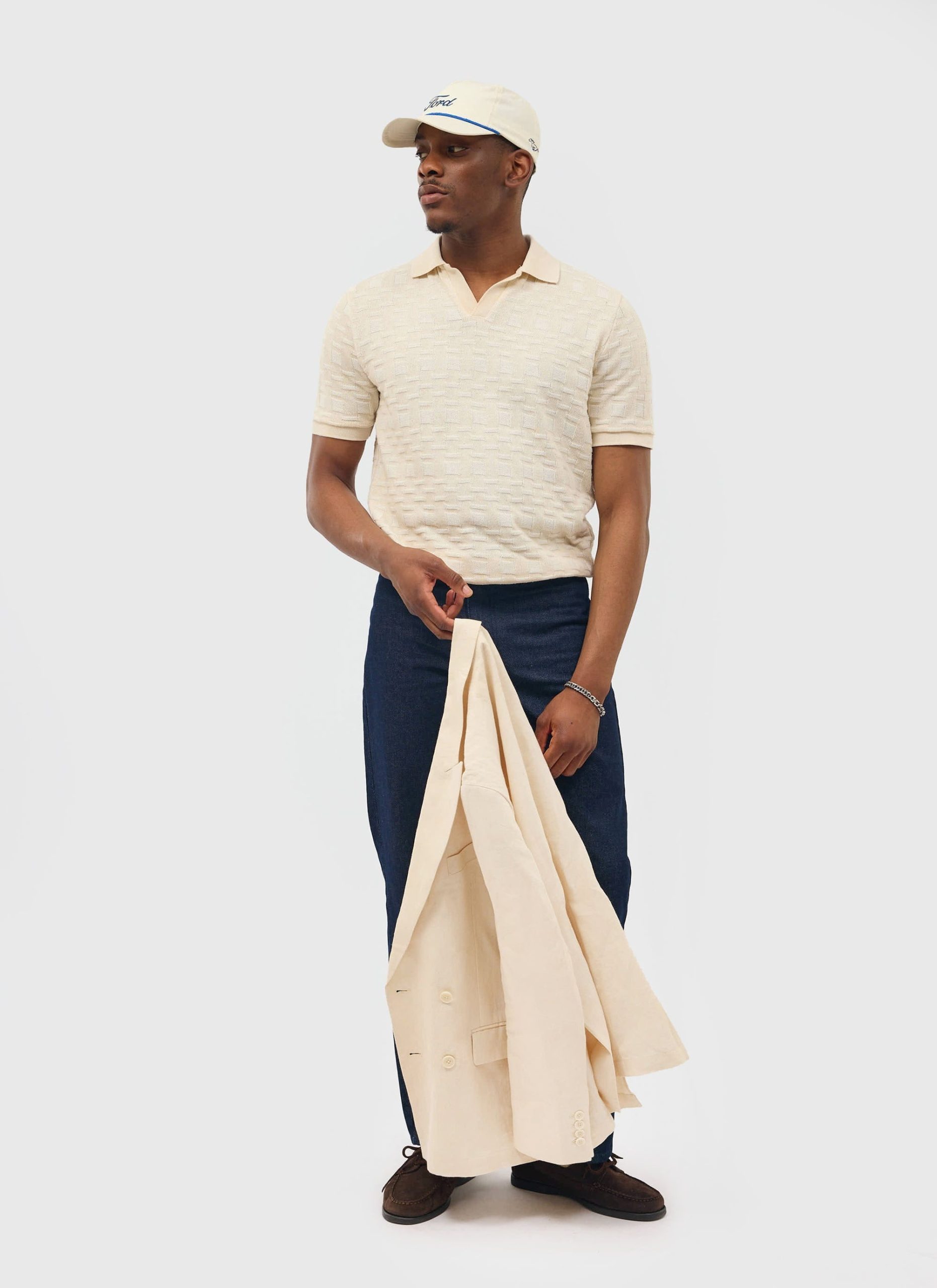 All hands on deck. Percival Deck negroni knitted shirt, polo shirt, a knitted organic cotton wonder, in a neutral natural ecru. Pairs perfectly with yacht or Percival denim, or linen short, add trouser or suit it up full smooth casual look. Cut in our classic negroni fit, length to the hip, with a bit of summer slouch in the width, fitted but comfortable, the perfect summer size.
