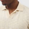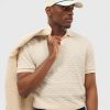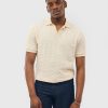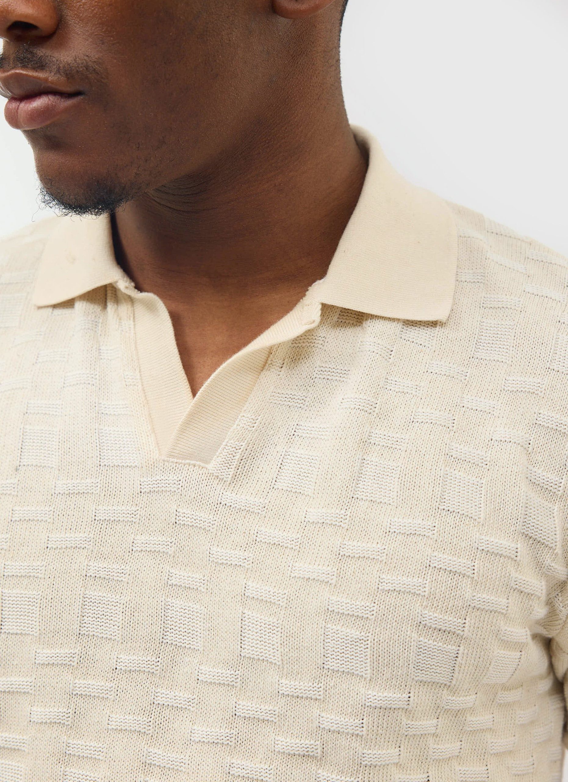 - Features: Men’s Knitted Polo Shirt in Cream. Made from a high quality cotton blend for a textured feel and look, the Open Collar Polo Shirt can be effortlessly styled with any piece or colour, elevating your summer style. This Cotton Polo Shirt fits true to size with a clean, comfortable fit. Cut at the hip, it offers a bit of room above the rib for ease and movement. This Open Collar Polo fits true to size with a clean, comfortable fit. Cut at the hip, it offers a bit of room above the rib for ease and movement.
