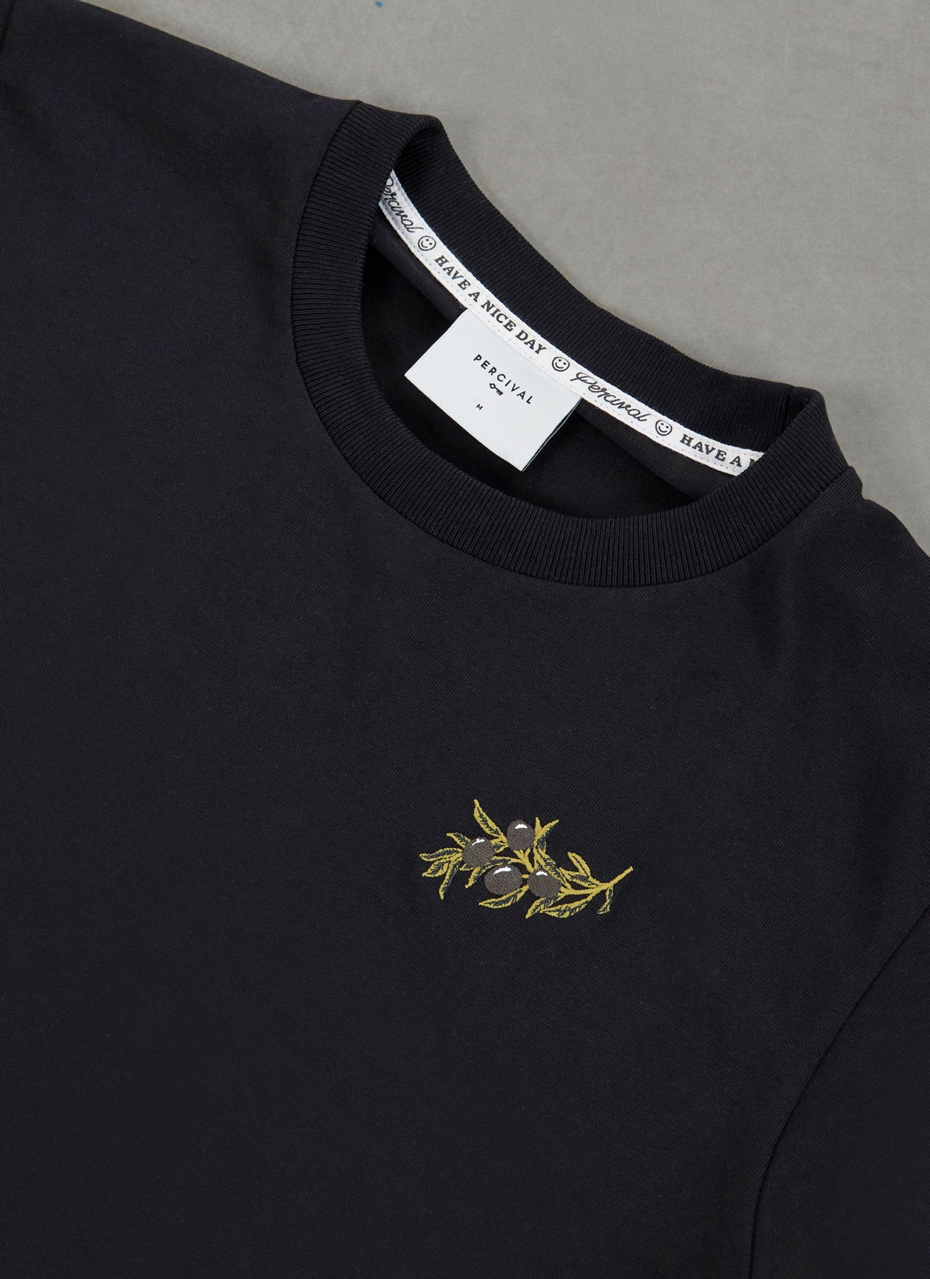 Percival Spring Summer 2025, full flavour, full Perci pomodoro, perelló, kalamata, amatriciana. A feast for your eyes, vibrant colours, rich silhouettes, all wrapped up for lucky customers. Olive tee, hand illustrated illustration embroidery at chest, molto bene.