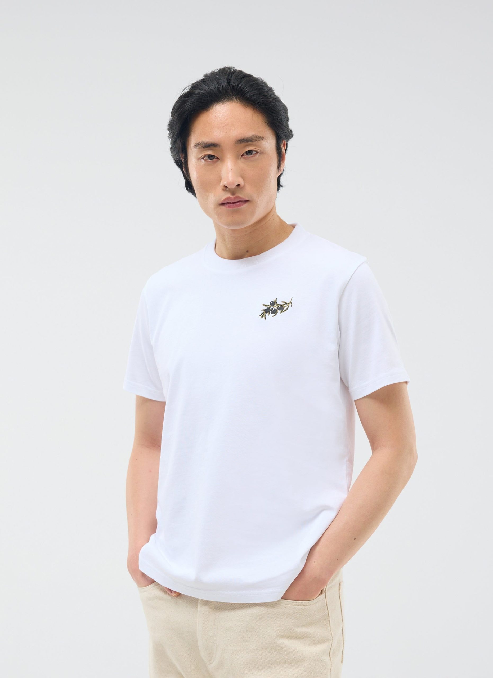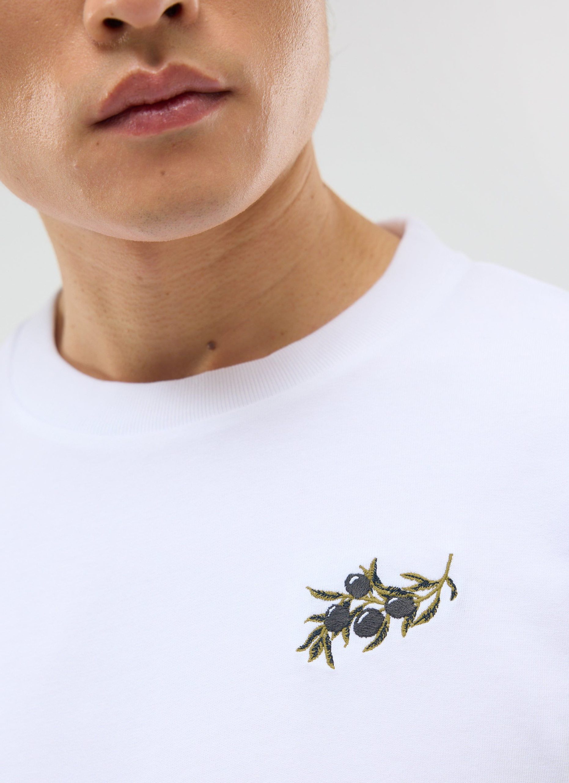 - Features: Men’s heavyweight white T-Shirt featuring intricate olive tree embroidery. Crafted from 100% organic cotton, this durable short-sleeve tee offers a premium feel. Designed in a regular fit, it pairs effortlessly with any outfit for any occasion.