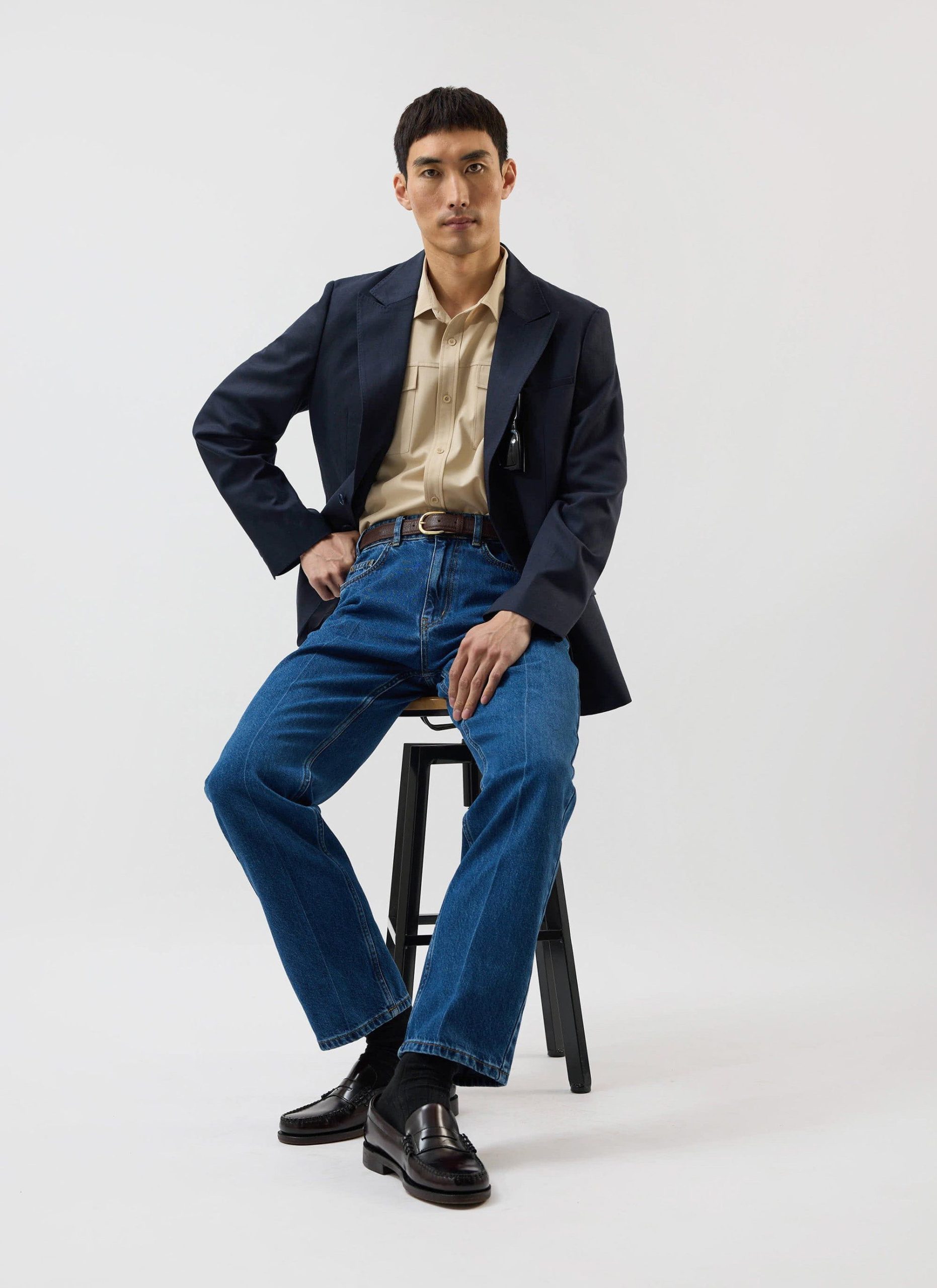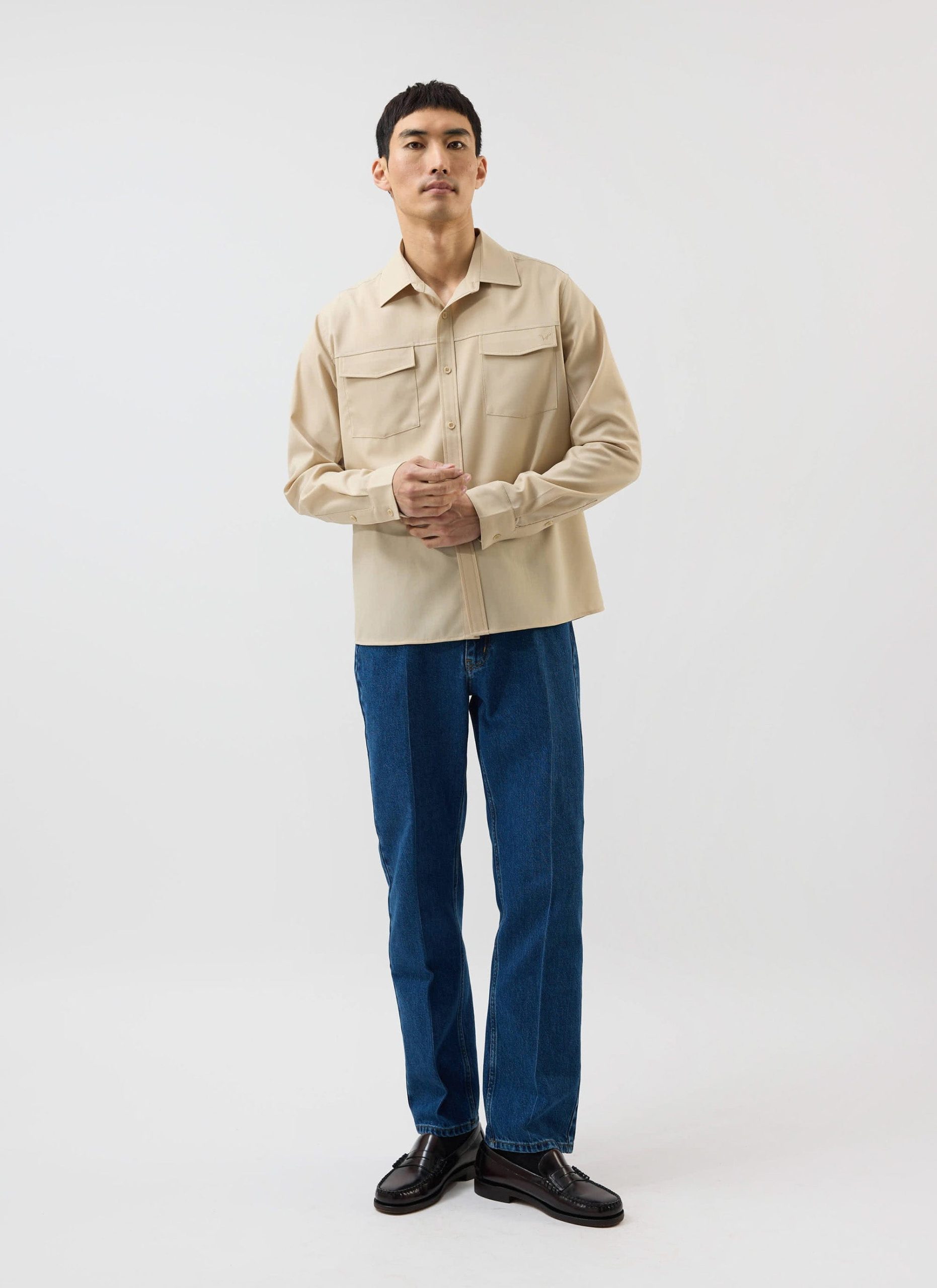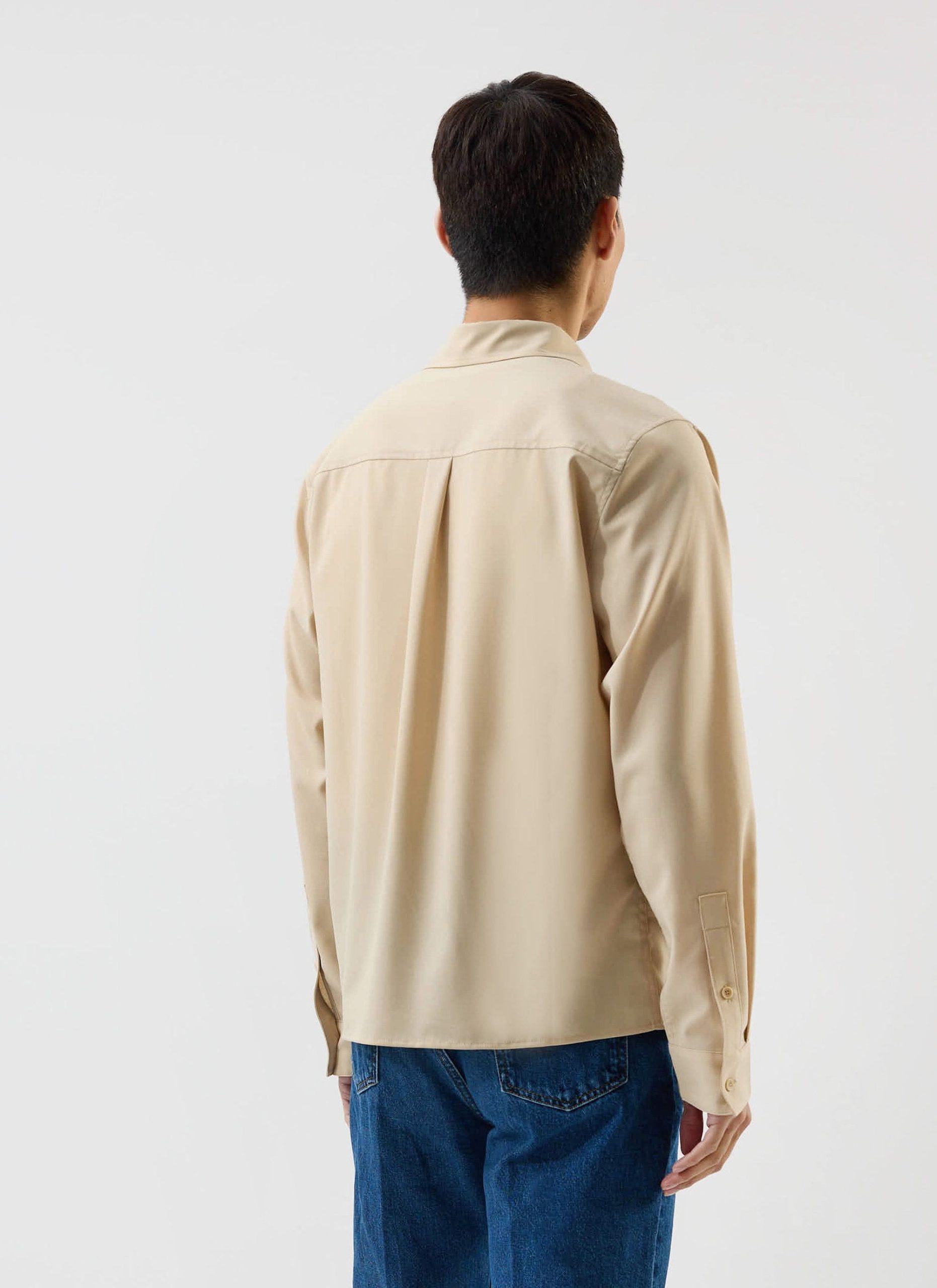 - Features: Men’s Long Sleeve Utility Shirt in Beige, as part of the . This regular fit shirt is made from a premium wool blend, offering a refined take on classic safari styling. Featuring two chest pockets, a sharp point collar, easily foldable sleeves, and subtle tonal stitching, it delivers a smart update to vintage American workwear. A versatile piece for layering or standalone wear across seasons.