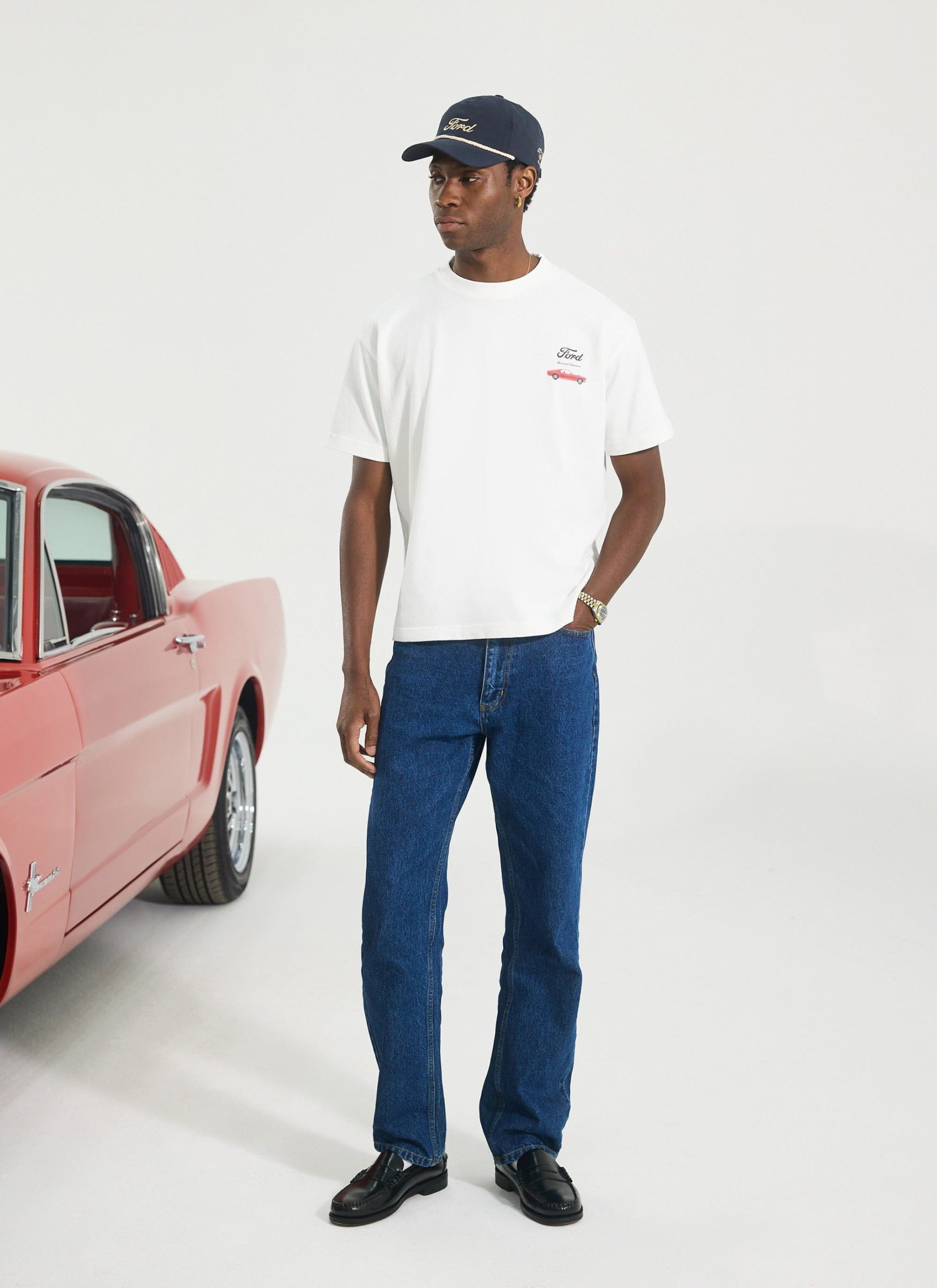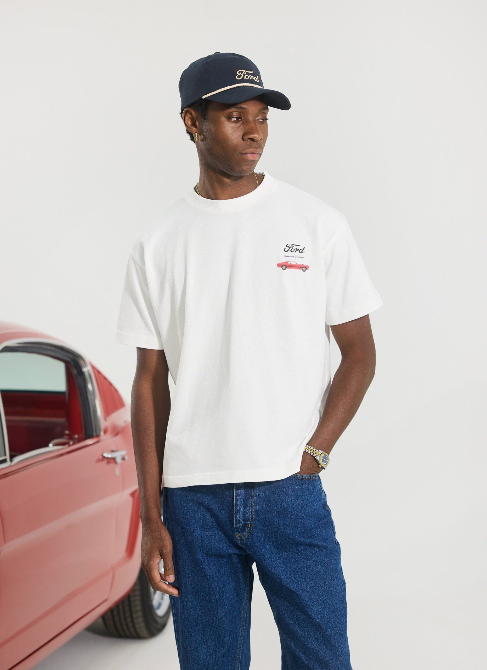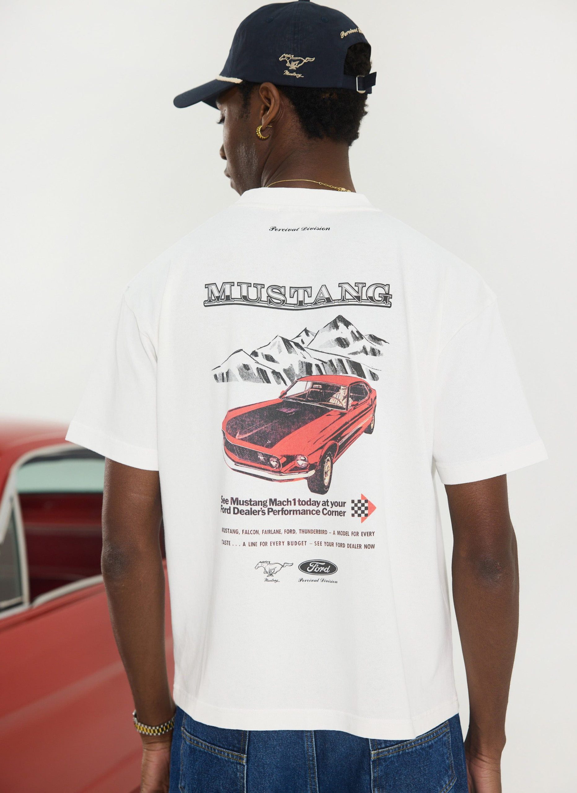 - Features: Men’s Ford print T Shirt made from a heavyweight cotton in white. Finished with screen printed front and back detail of the 1969 Ford Mustang Mach 1 295. This oversized tee is ideal for everyday wear, combining comfort and style.