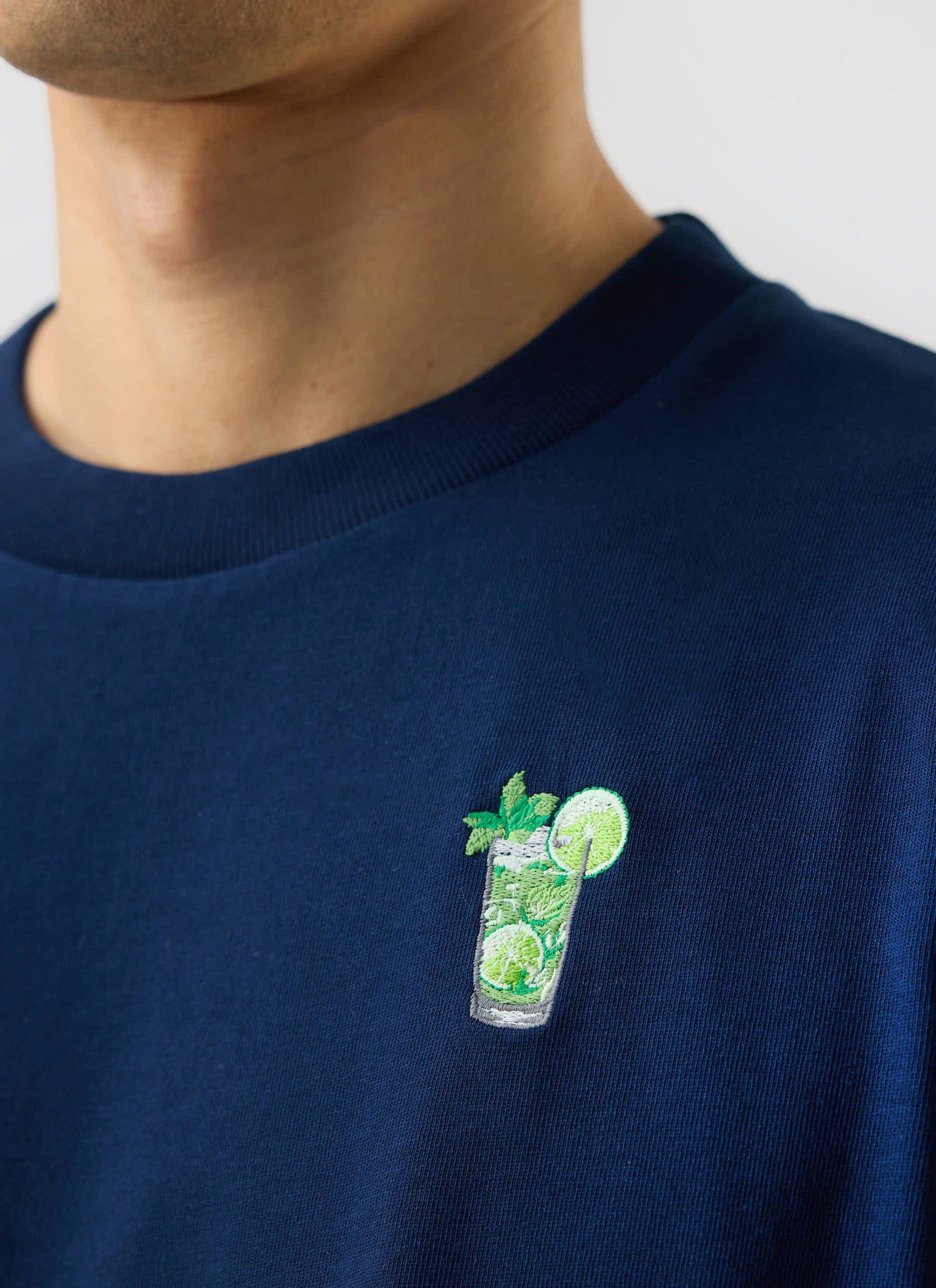 - Features: Men’s Heavyweight T Shirt in Navy, made from premium organic cotton. This regular fit tee features intricate mojito cocktail embroidery on the chest and a ribbed neckline for long-lasting comfort. A refined staple for everyday wear, it balances quality and style for any occasion.