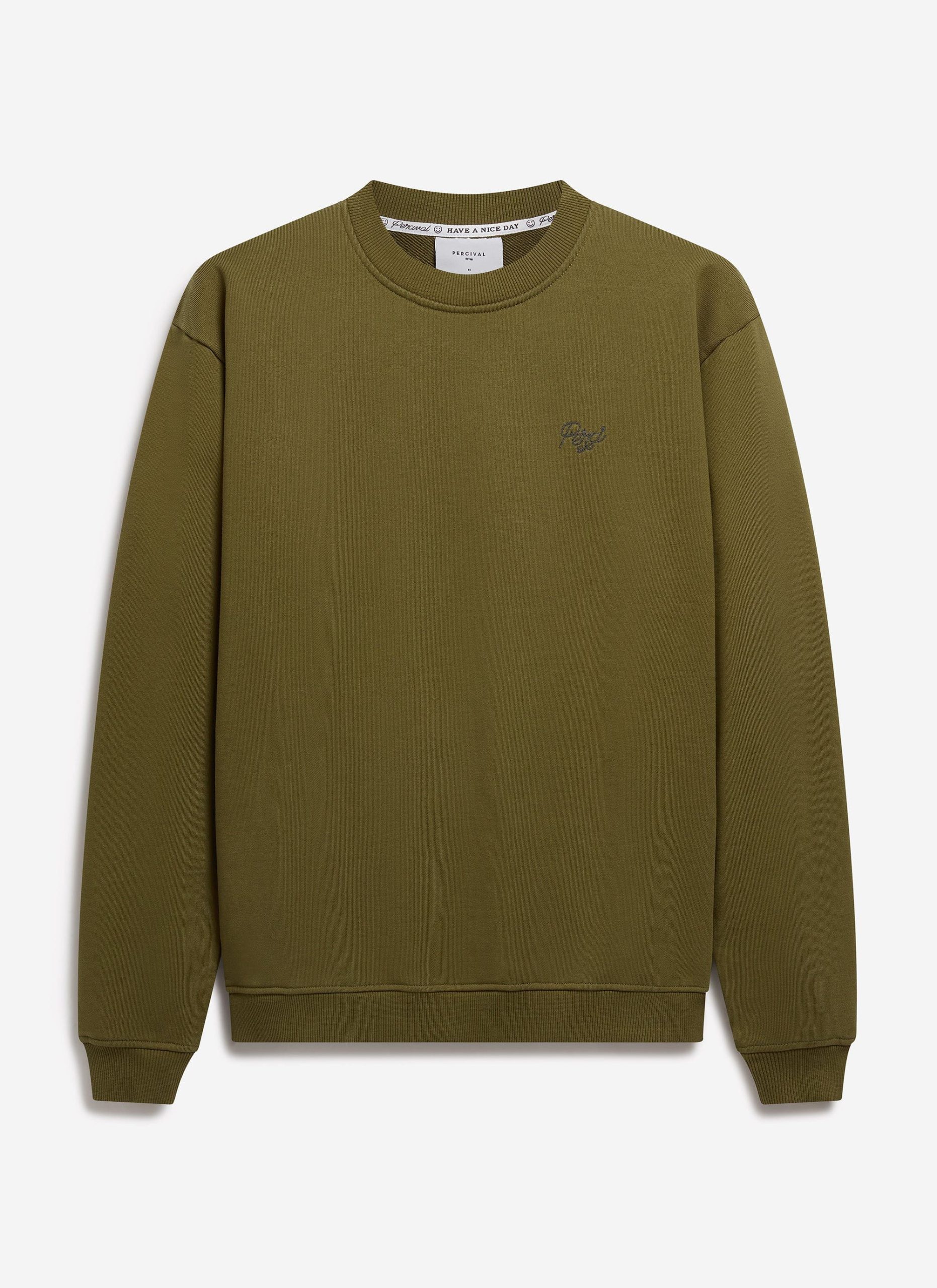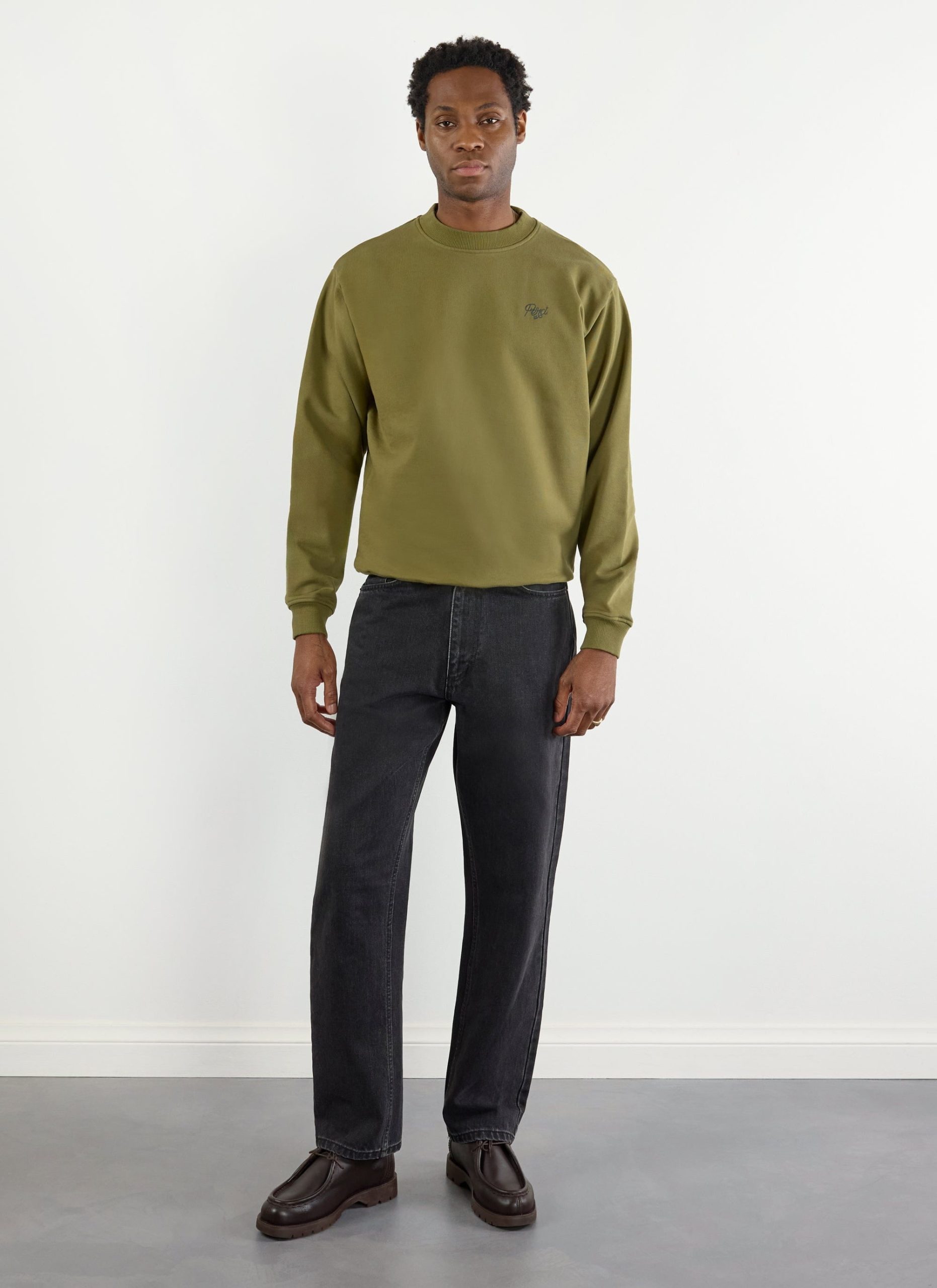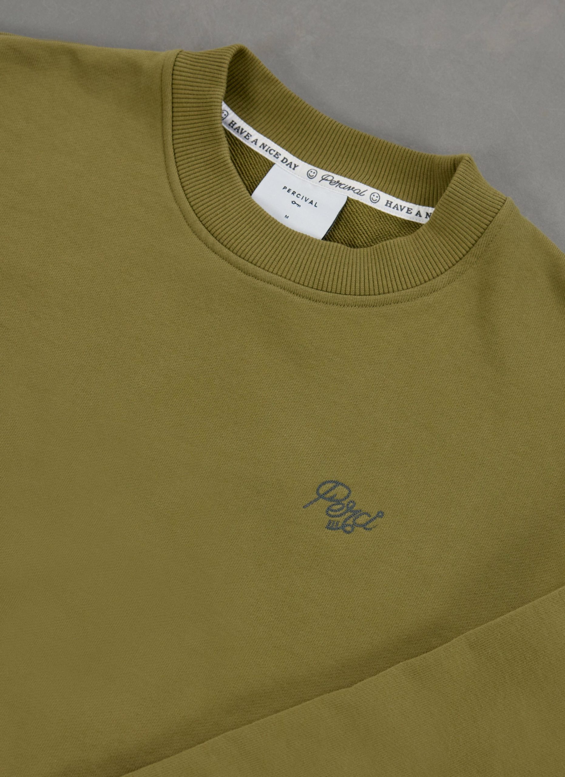 Our popular Percival heavyweight organic cotton sweat. A perfect Olive colour, suitable for any season. Ease of wear and styling and comfort. Comfort in quality 450g heavyweight organic cotton made in Portugal jersey. Classic fit, cut just on the waist with quality rib on hem and cuff.