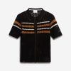 - Features: Men’s Knitted Shirt in Black. Made from 100% cotton for a textured look and feel, this knit polo is a clean yet playful summer staple. Easy to style with most colours, it pairs perfectly with Percival linen shorts or trousers. This button down summer shirt is a relaxed fit that features a subtle crochet design across the chest and intricate stitching on the collar.