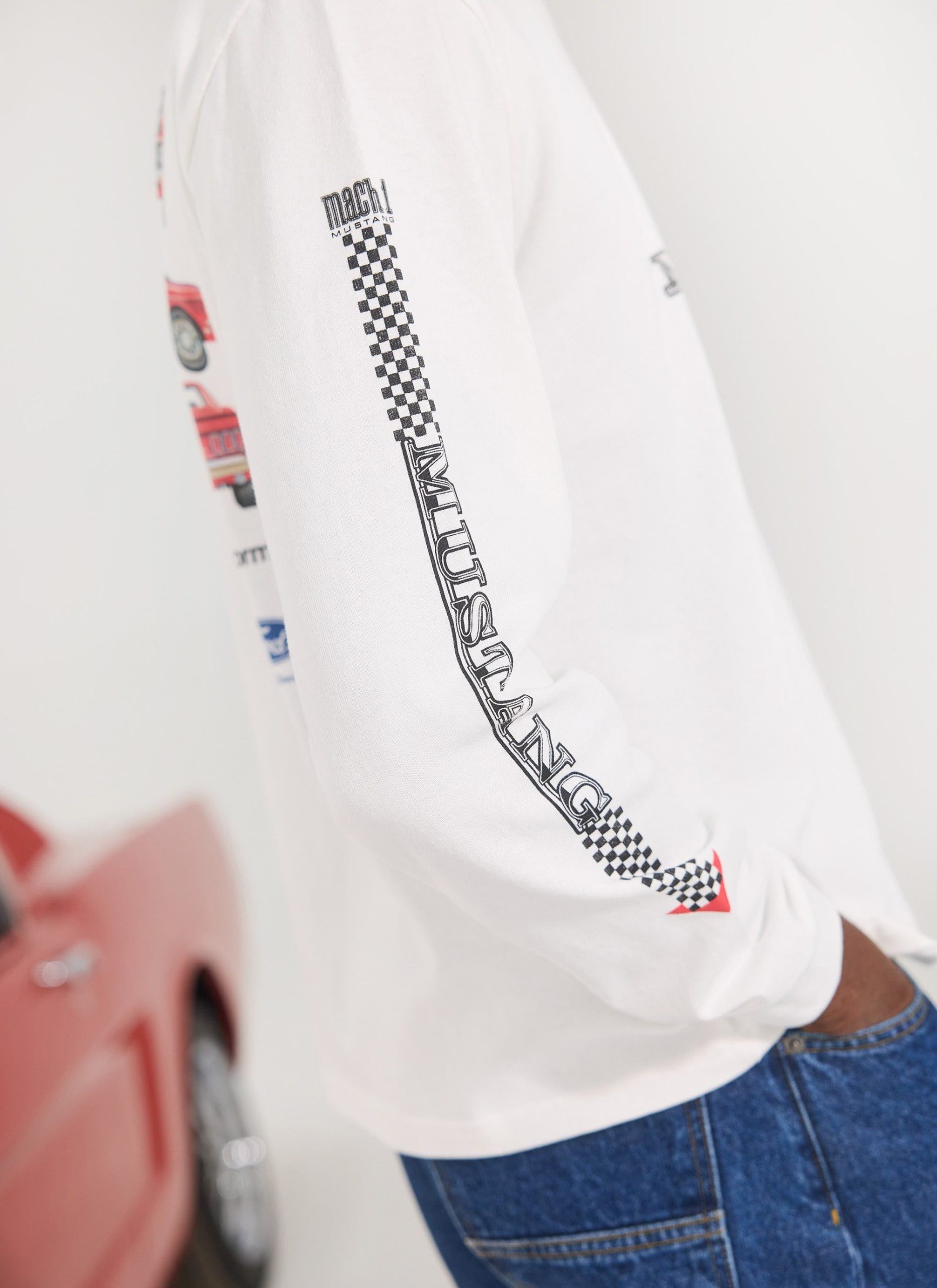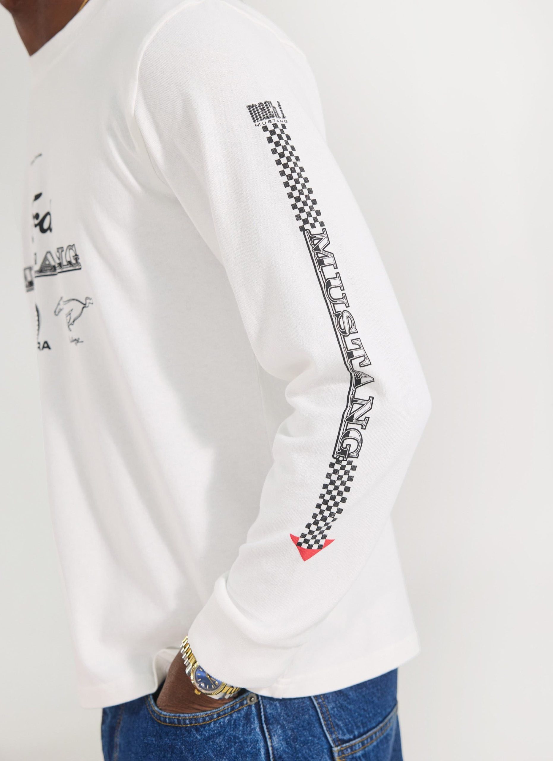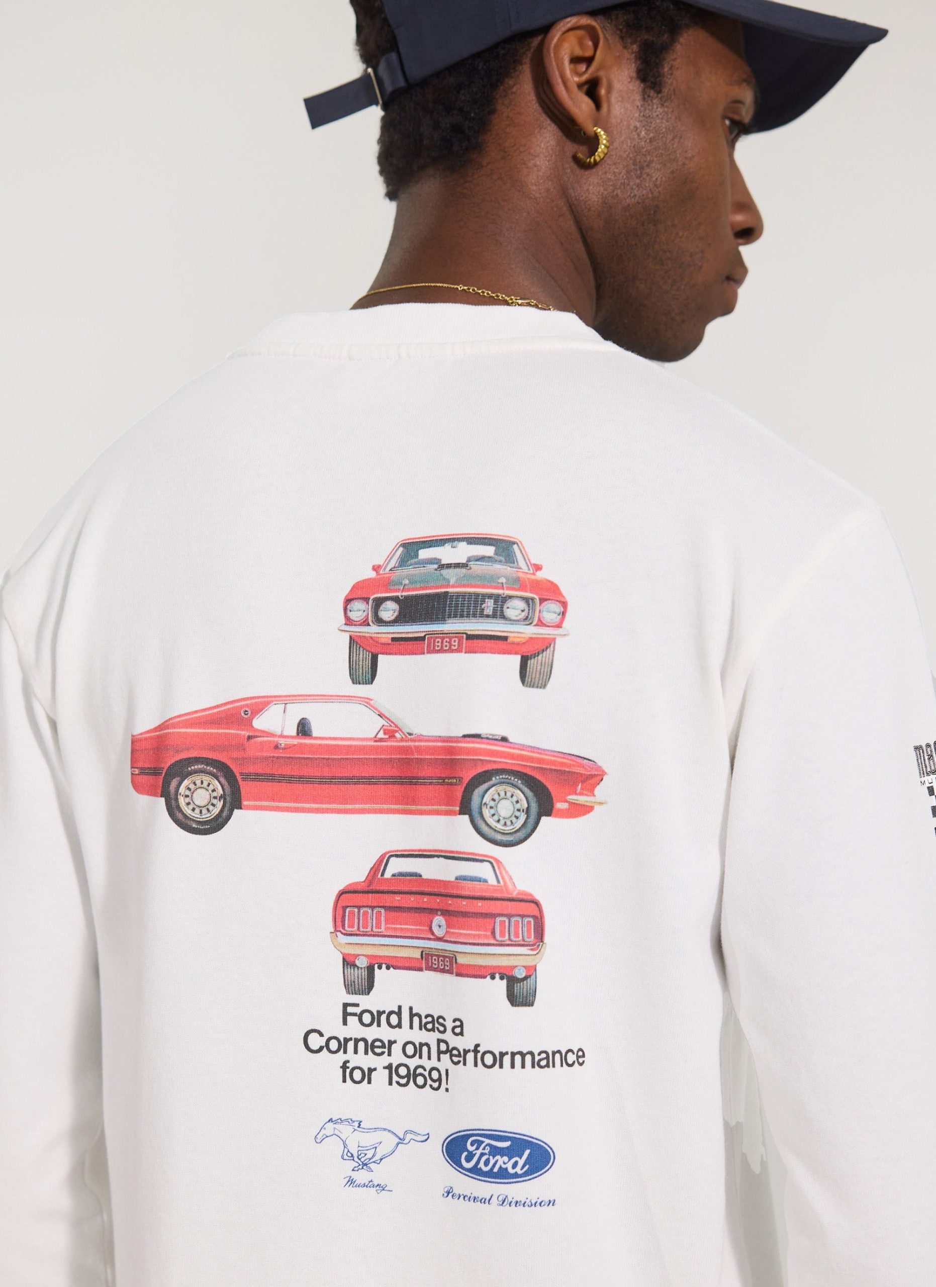 - Features: Men’s white long sleeve T Shirt made from a heavyweight cotton. Featuring a screen printed back detail of the 1969 Ford Mustang Mach 1, this Ford x Percival collection tee is an easy to wear staple.