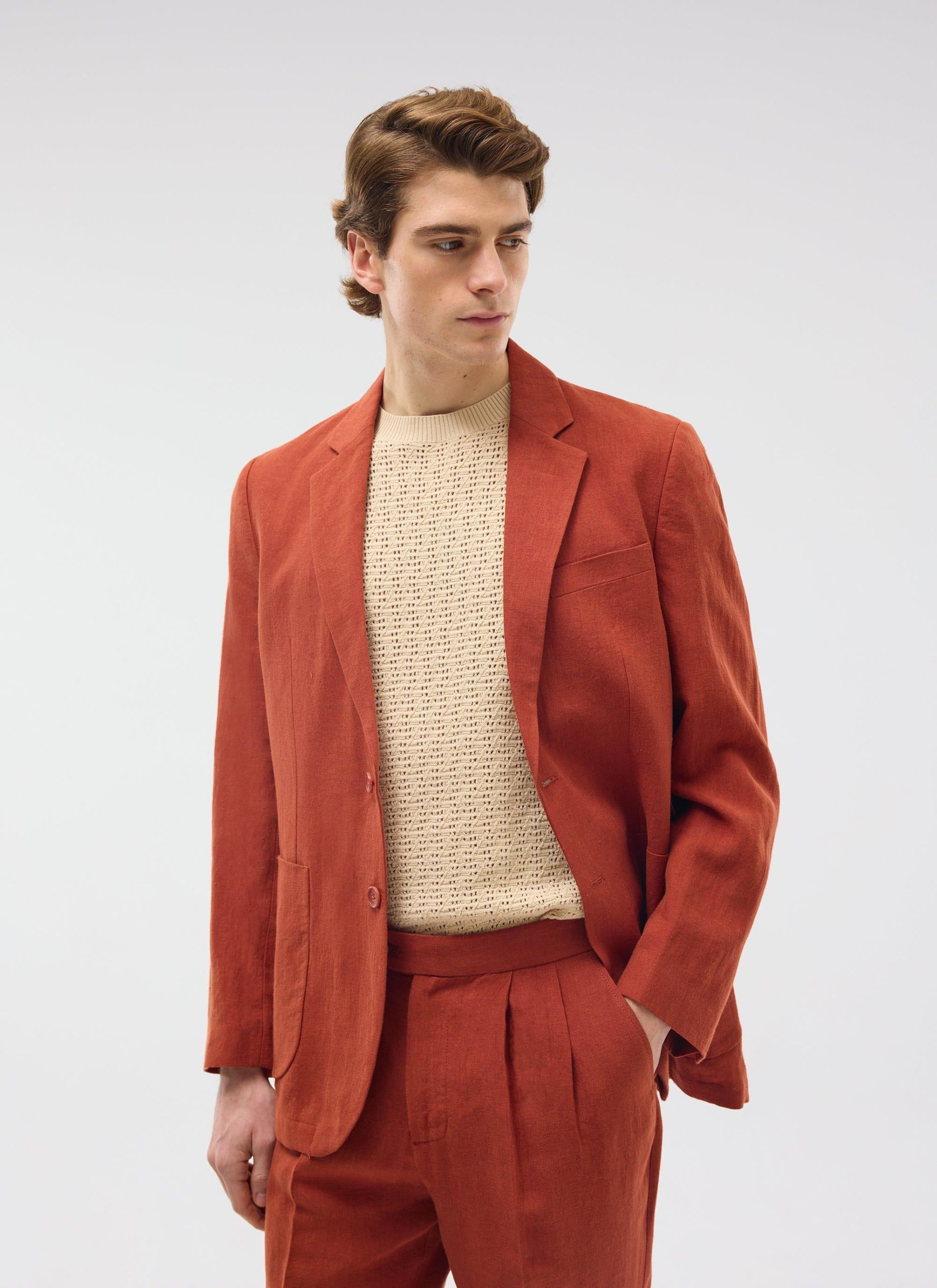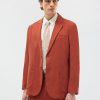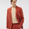 - Features: Men’s Linen Blazer in Red, made from a lightweight 100% Linen fabric in a rust red colourway. Our Red Linen Suit Jacket is made with increased body and sleeve widths for comfort and thin shoulder pads for a structured shape. The Relaxed Blazer in Red is finished with back vents, chest pockets and button-fastening. This lightweight Linen Suit Jacket is ideal for Weddings & Smart Dressing all year round.