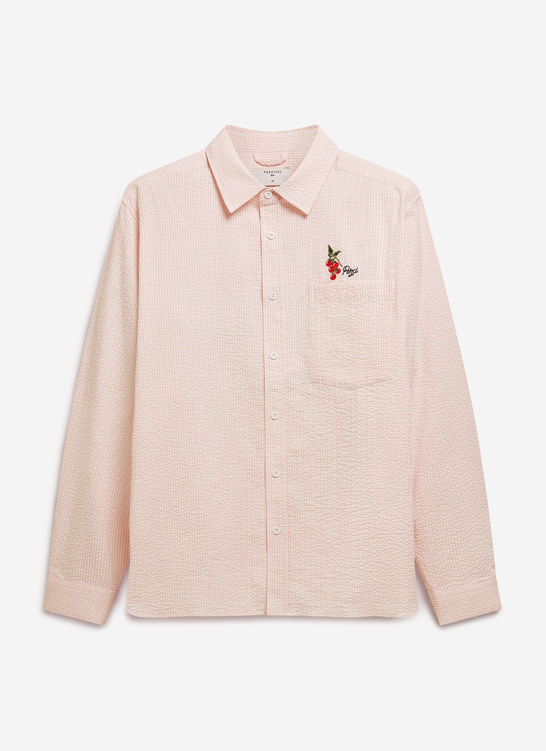 - Features: Men’s Long Sleeve Shirt in Pink, crafted from 100% organic cotton for exceptional comfort. Featuring an intricately woven illustration, this embroidered oversized shirt is perfect for year-round wear—whether worn on its own or over a tee. Designed with a breast pocket, point collar, and signature Percival buttons, this versatile piece is a must-have for any man’s wardrobe.