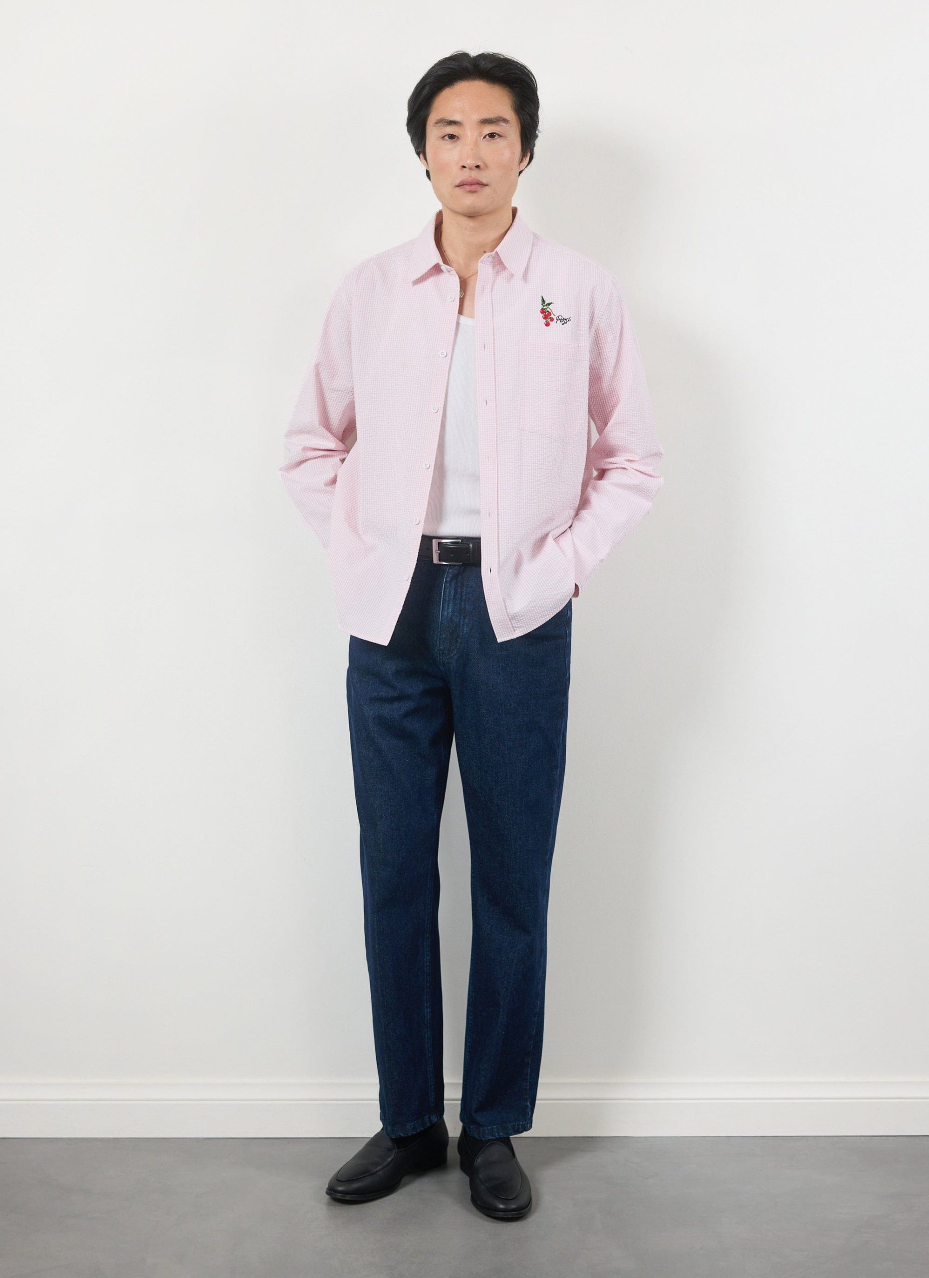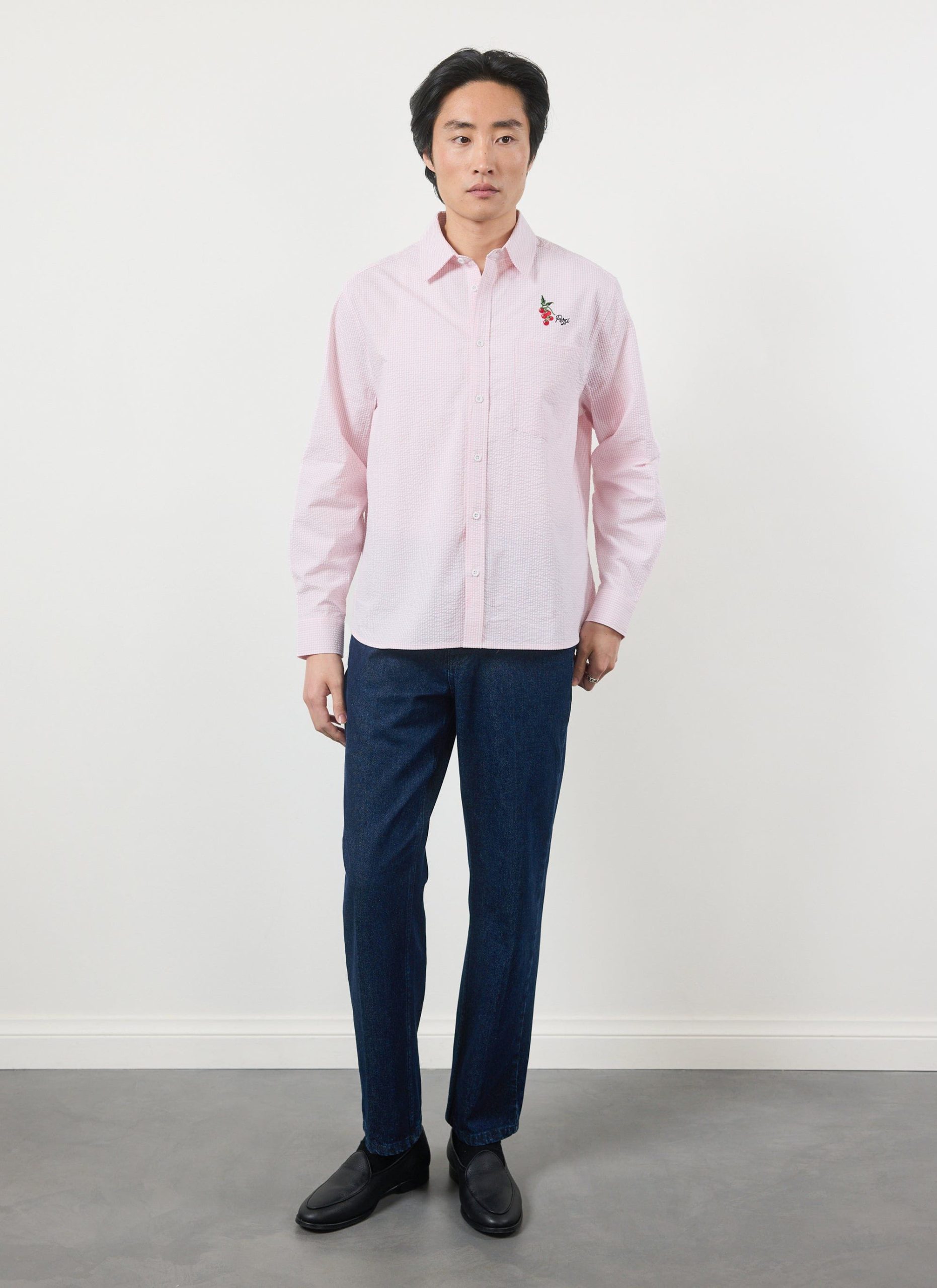 Sardinia oversized long sleeve shirt, fetching pink seersucker. Pink is for everyone and it can be for you this summer, for yes, summer is coming, well done, we will make it. Celebrating holidays to the sun, Sardinia and Sardinian tomatoes, full of tradition, excellence. Full flavour, Percival Spring / Summer 2025.