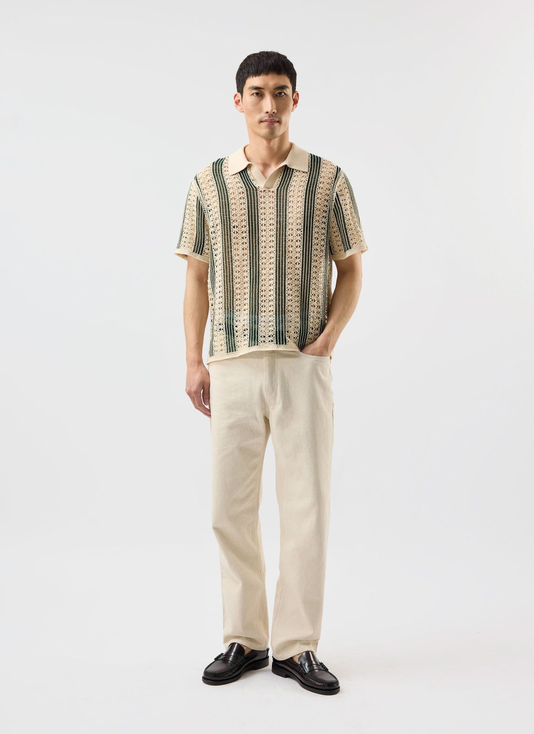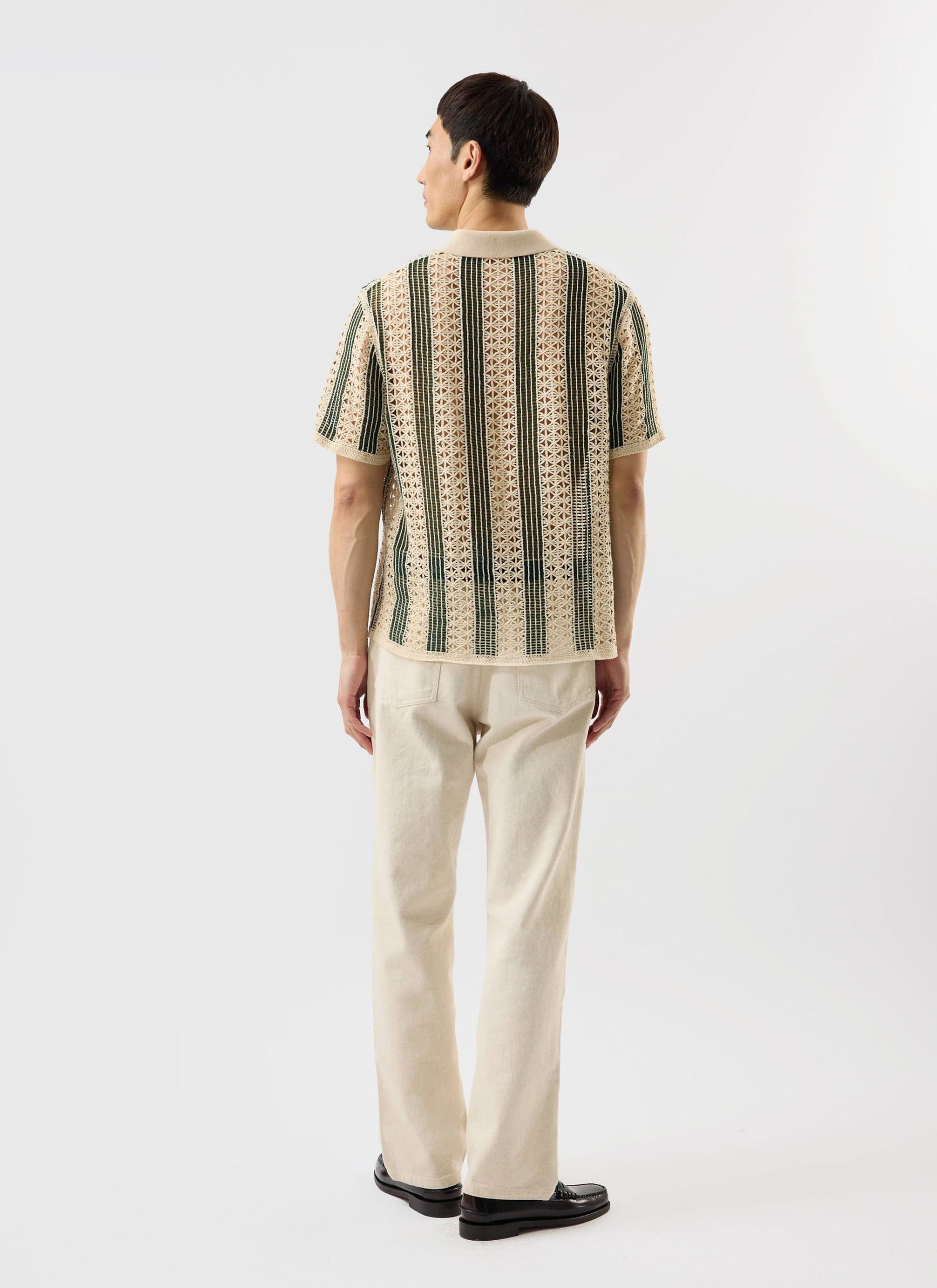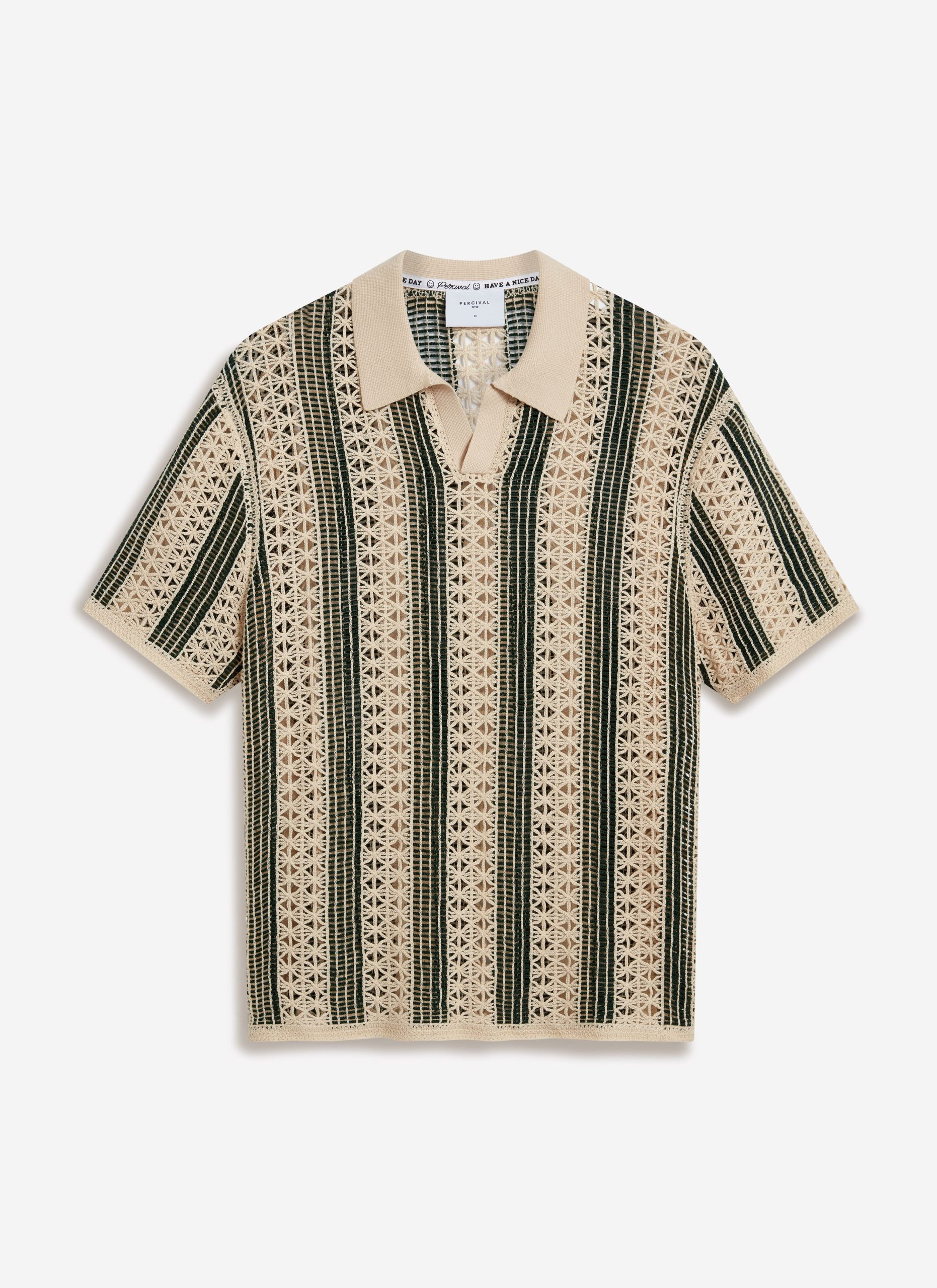 - Features: Men’s knitted polo shirt with an open collar, made from 100% cotton. Designed for a comfortable fit, this versatile polo is perfect for every occasion and pairs effortlessly with any outfit. A crochet polo shirt with vertical stripes, featuring an ecru collar, open placket, and crochet arm detailing, this men’s polo is a must-have for men who appreciate effortless style.