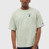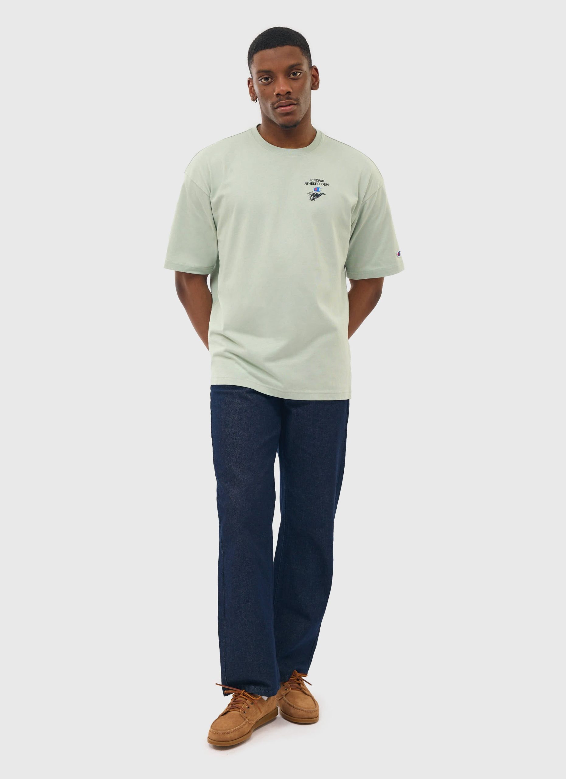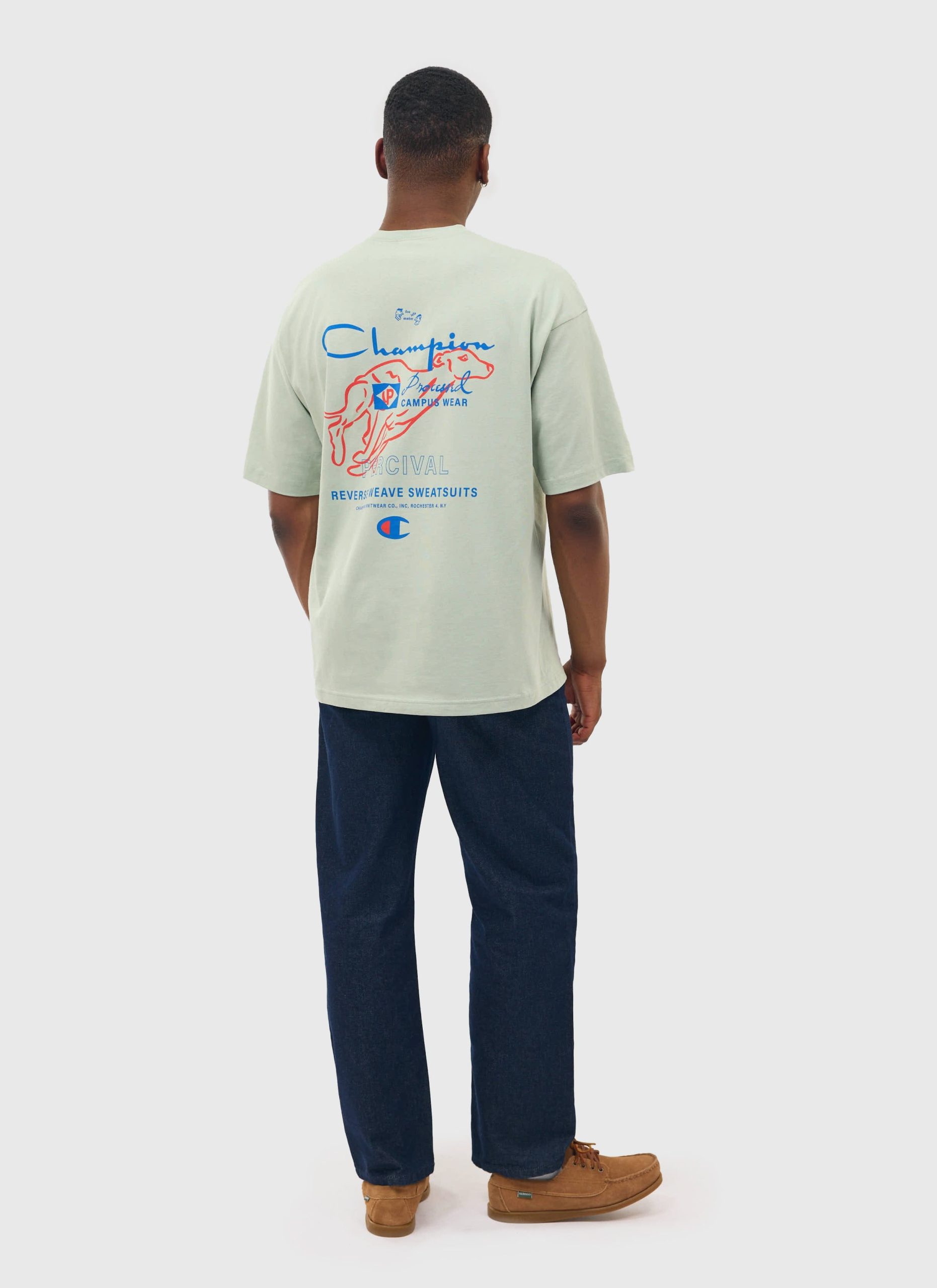 - Features: Men’s Oversized Champion T Shirt in Olive. This heavyweight t shirt is embroidered in London with a hand drawn Percival illustration ‘Greyhound’ and iconic C logo patch on the sleeve. The crew neck t shirt is a oversized fit for a relaxed but breathable feel. This reverse weave t shirt features relaxed sleeves and is perfect for everyday wear and layering.