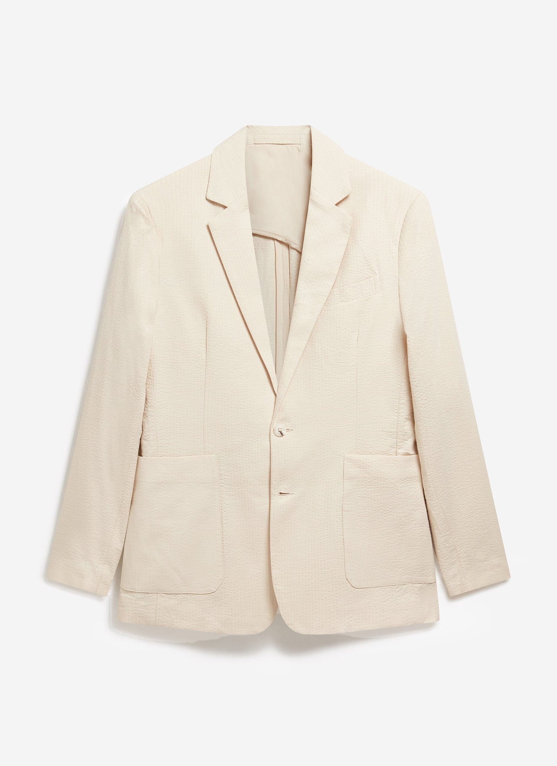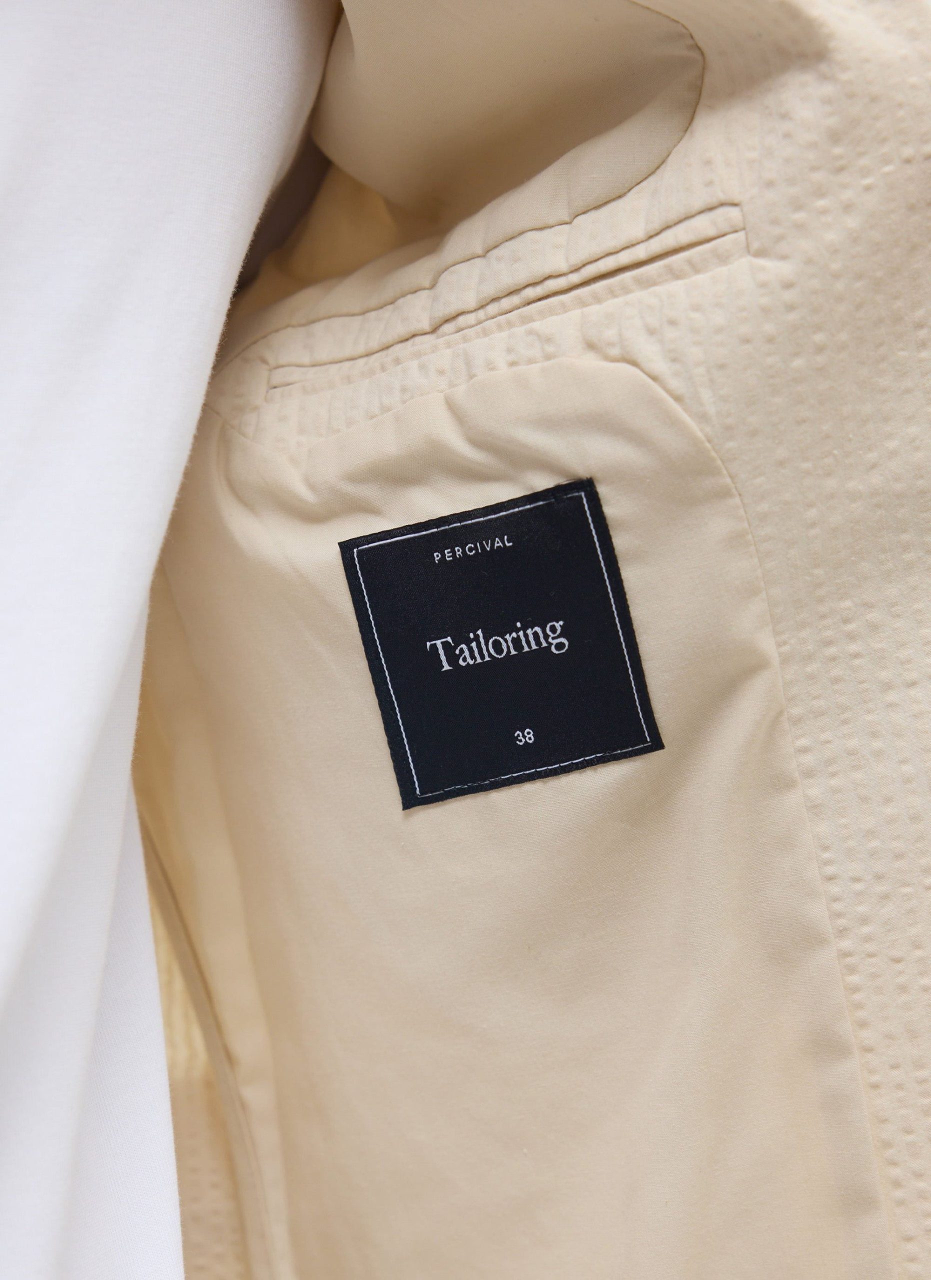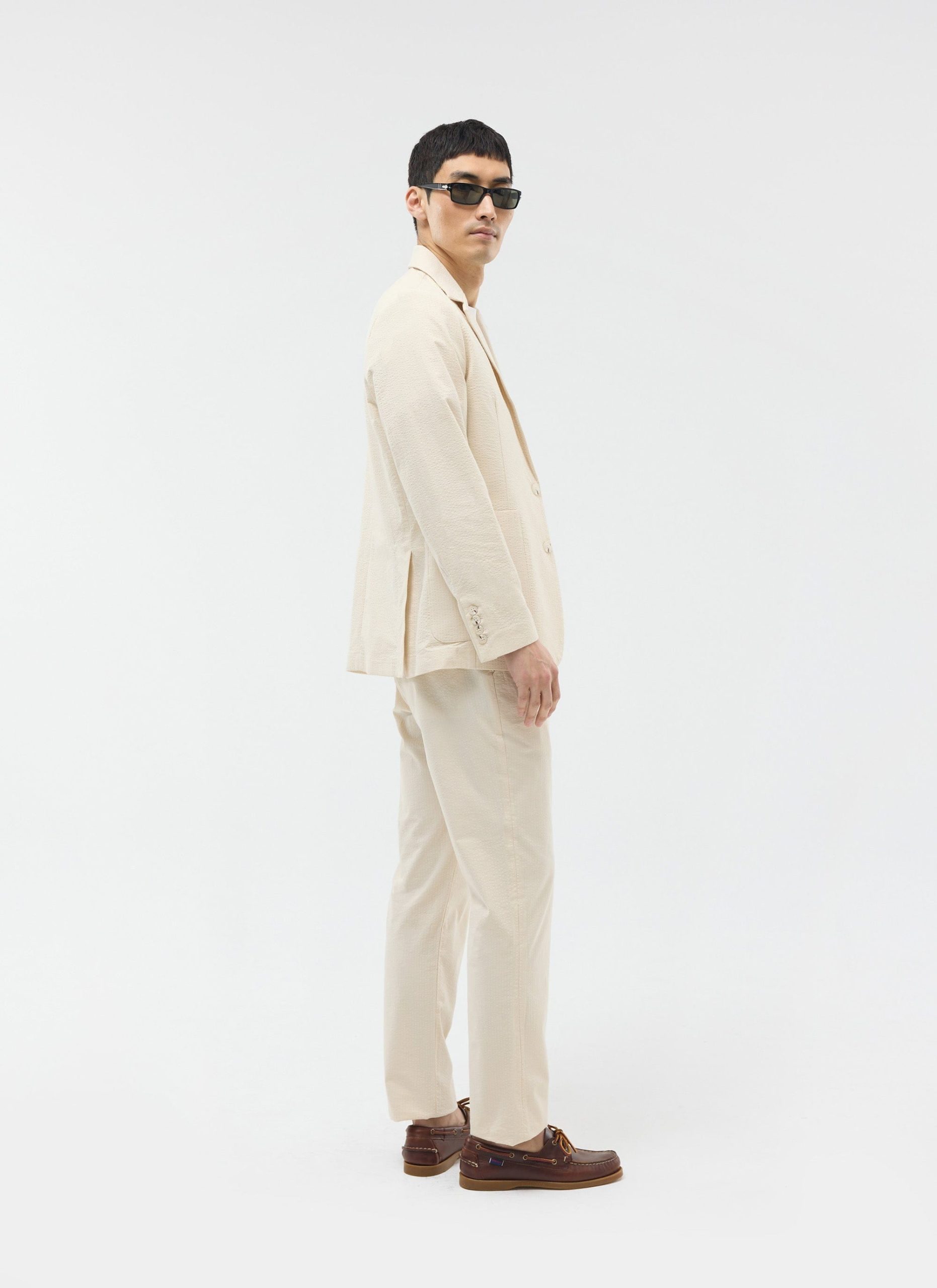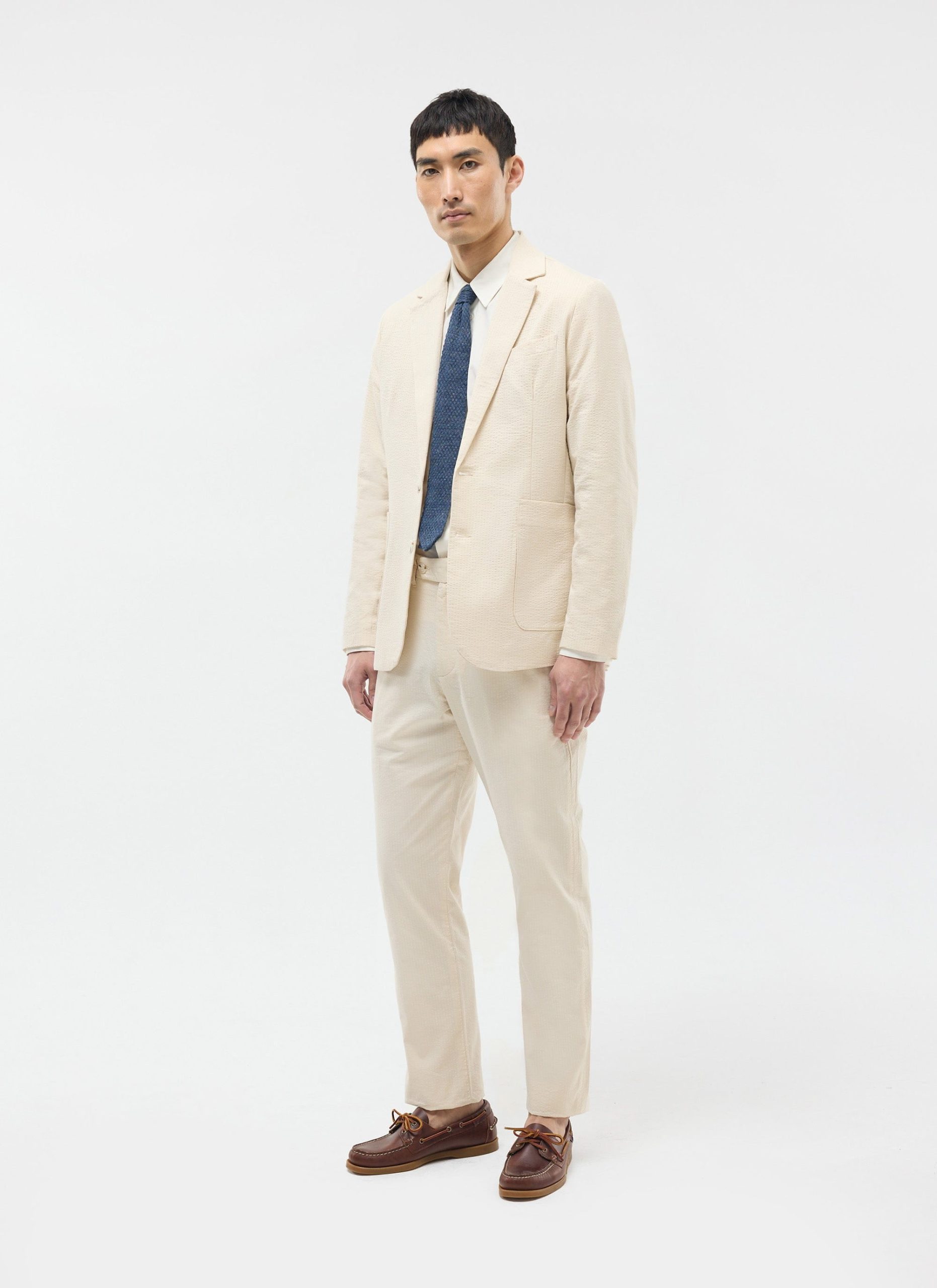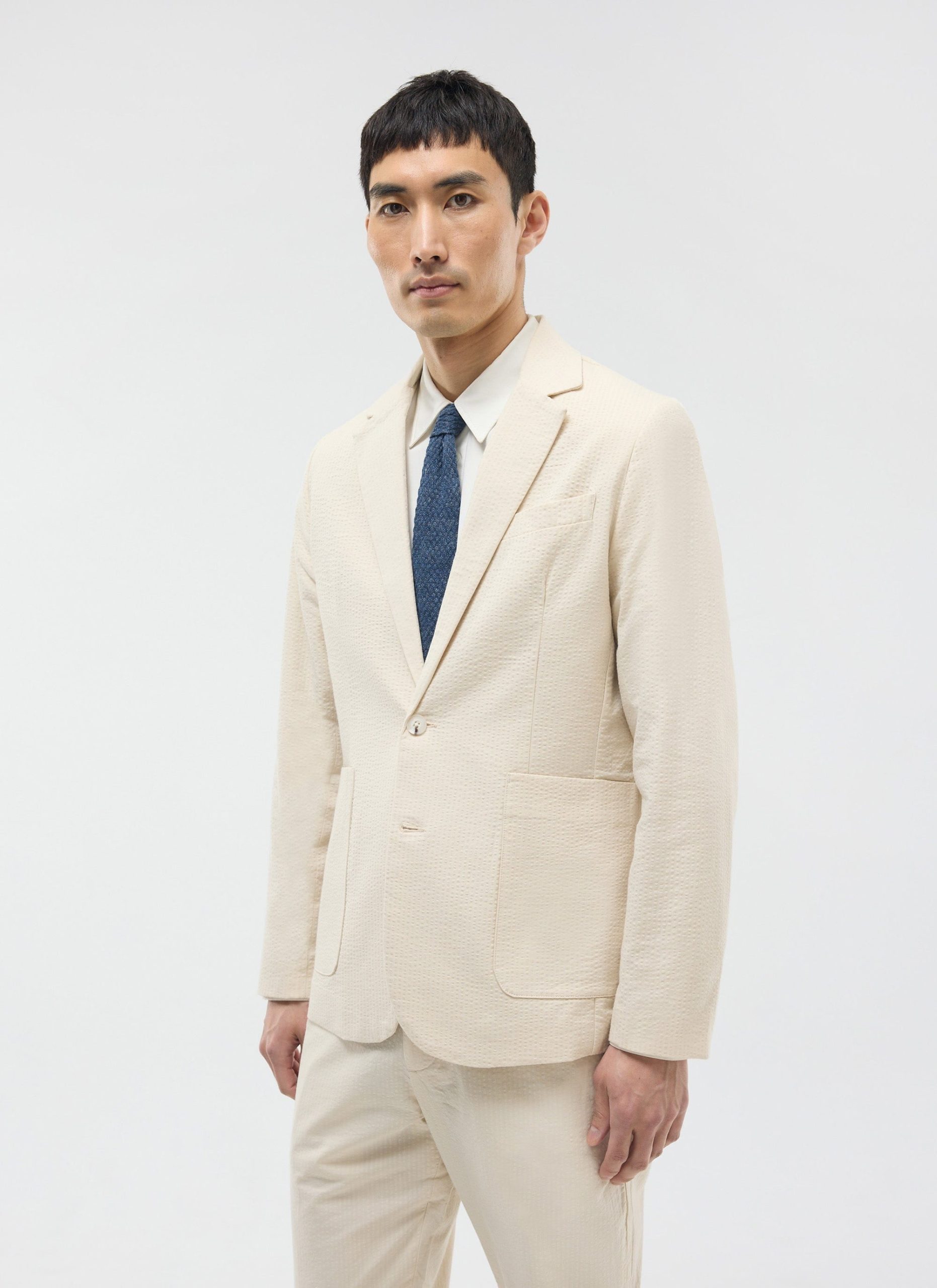 - Features: Men’s Seersucker Suit Jacket in Stone Cream made from a seersucker texture, with updated body and sleeve widths for comfort. The jacket features button-fastening, side patched pockets, chest welt pocket, back vents and internal welt pockets thin shoulder pads for a structured shoulder shape. This green seersucker suit jacket is ideal for weddings and smart dressing but can be worn in all occasions due to the versatility of the cotton.