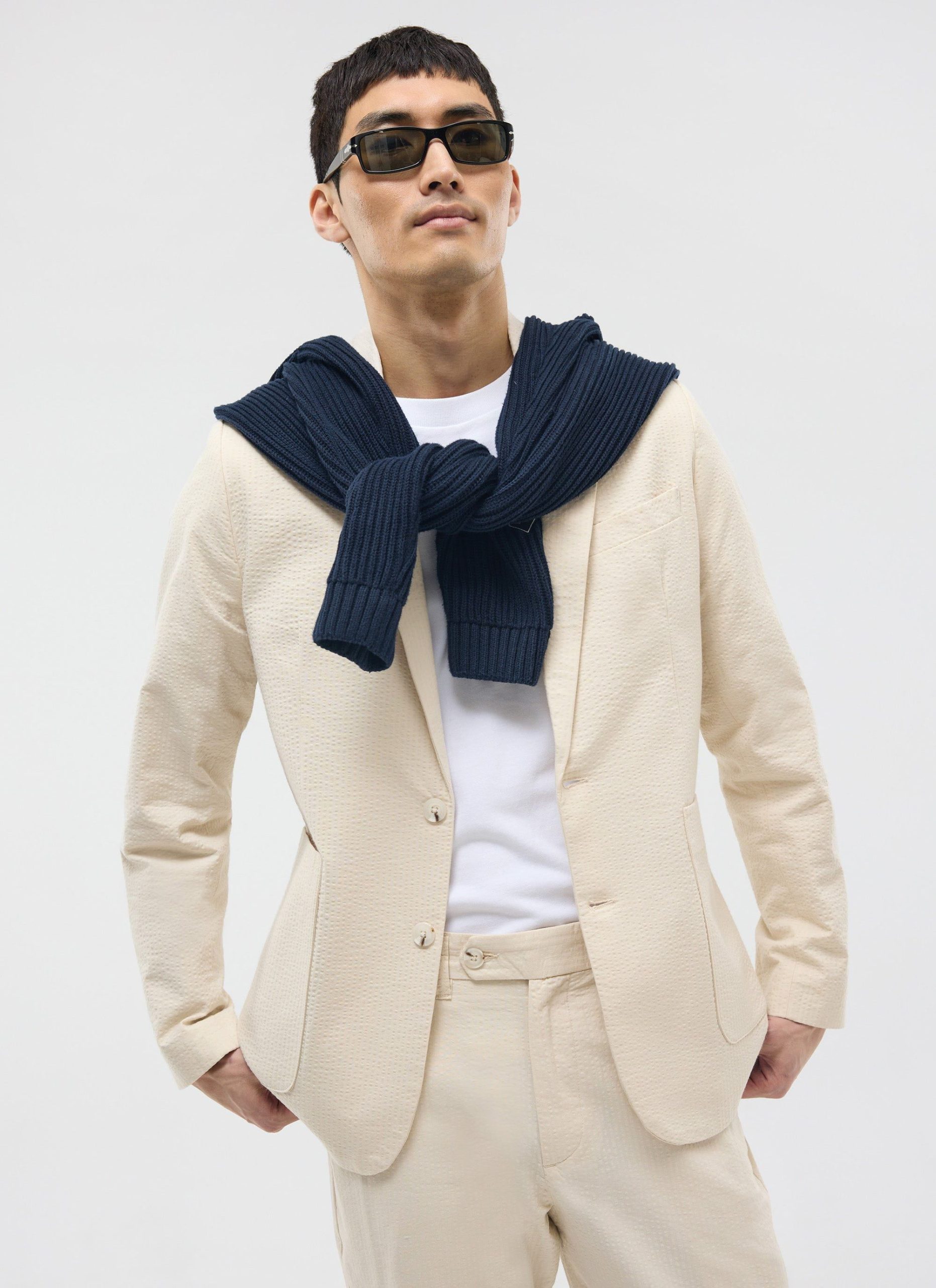 Seersucker for those that don’t have google is a lightweight fabric with a crimped or puckered surface, no need to iron, easy to wear tailoring. A tailoring survival pack for the perfect weekend get away.