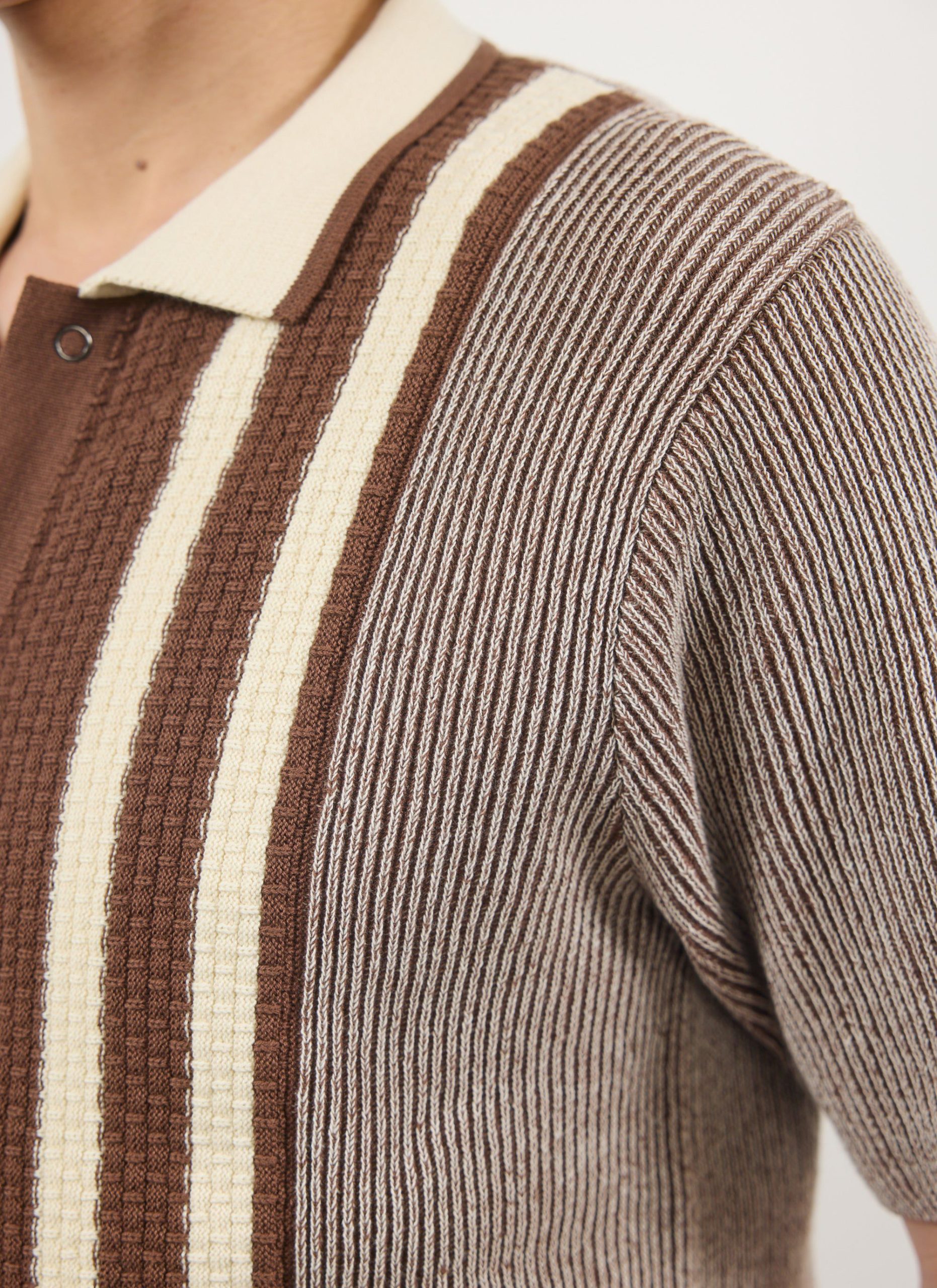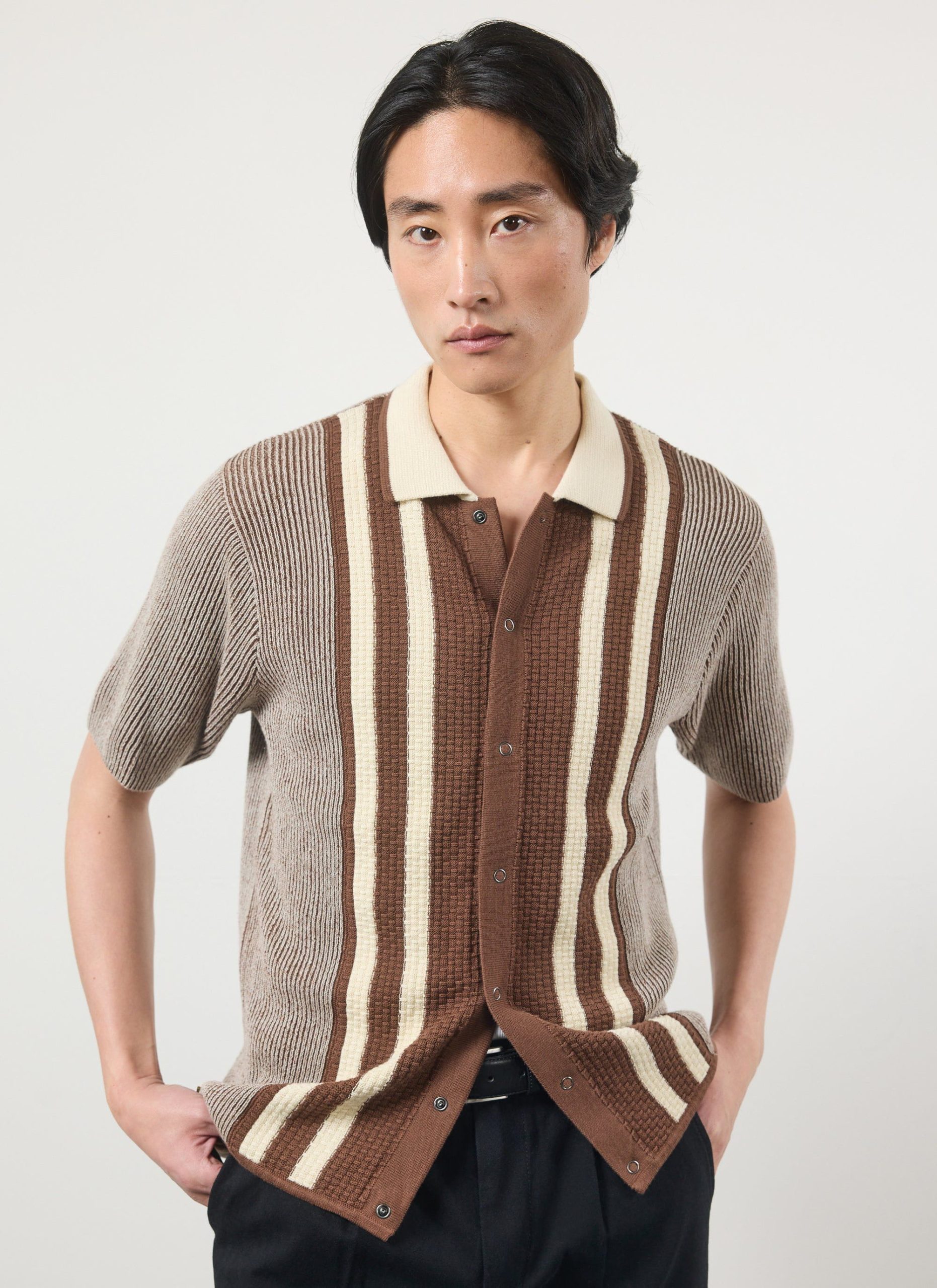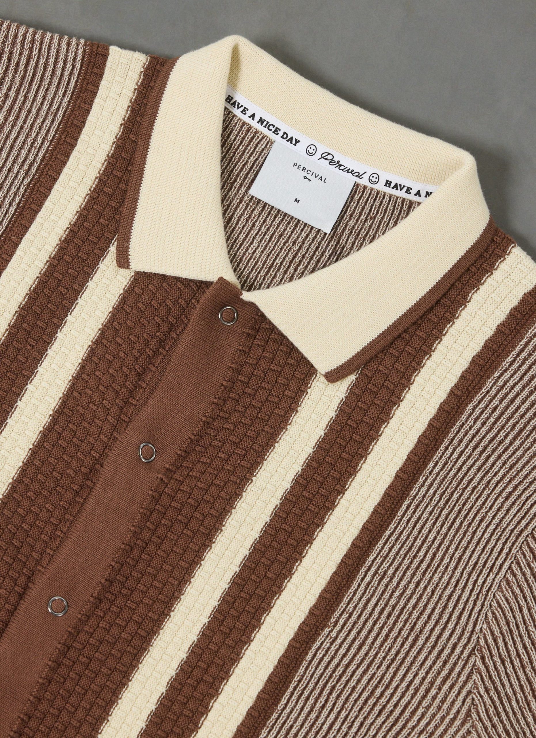 - Features: Men’s knitted polo shirt made from premium 100% cotton. This retro knit inspired piece is finished with a ribbed collar, stripe front chest and cardigan stitch body. This button down shirt comes in a standard fit making it perfect for all year round and wearing with any style of outfit.