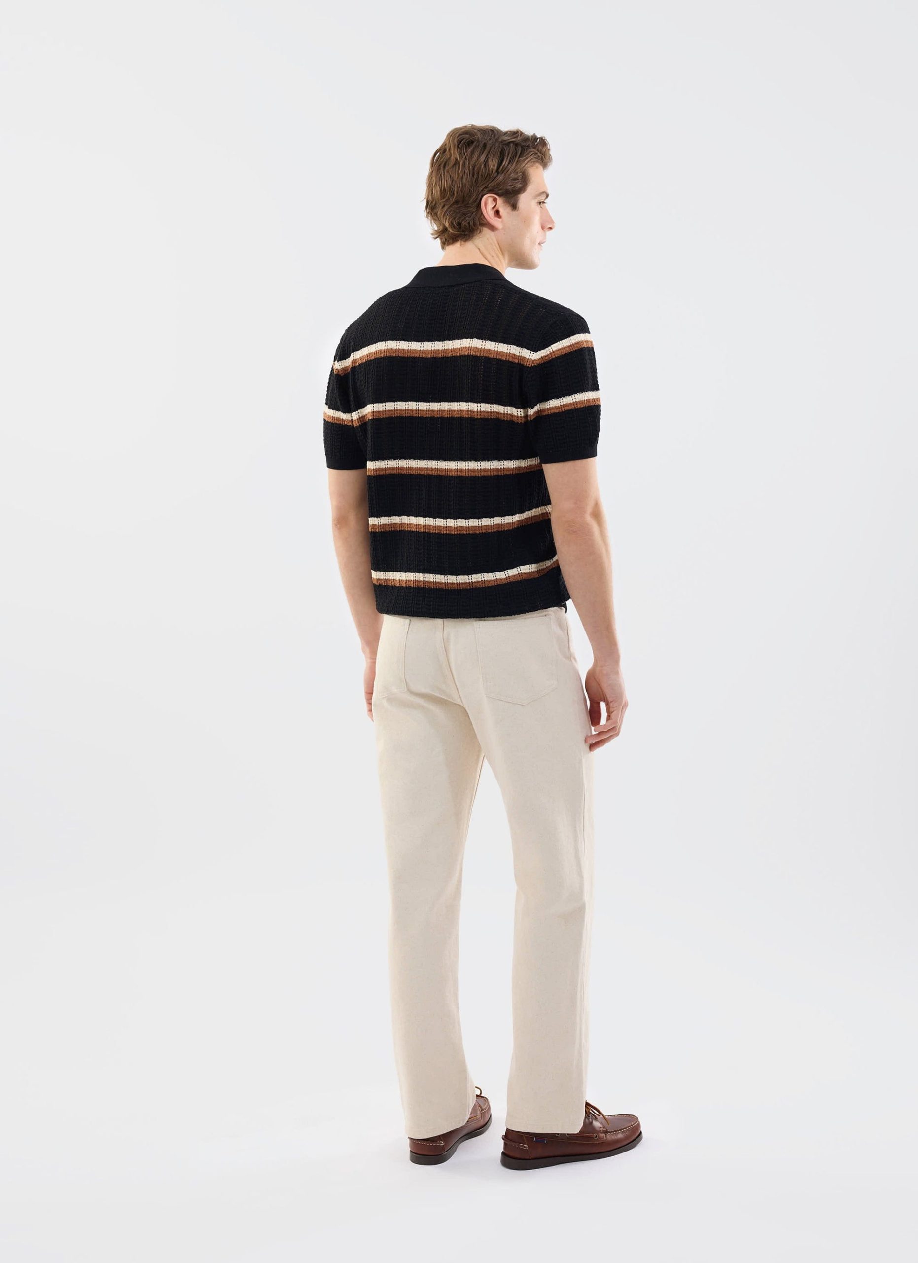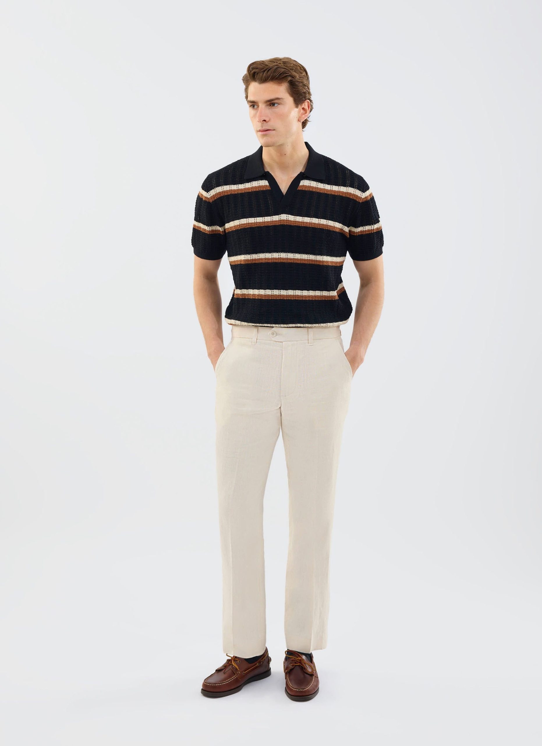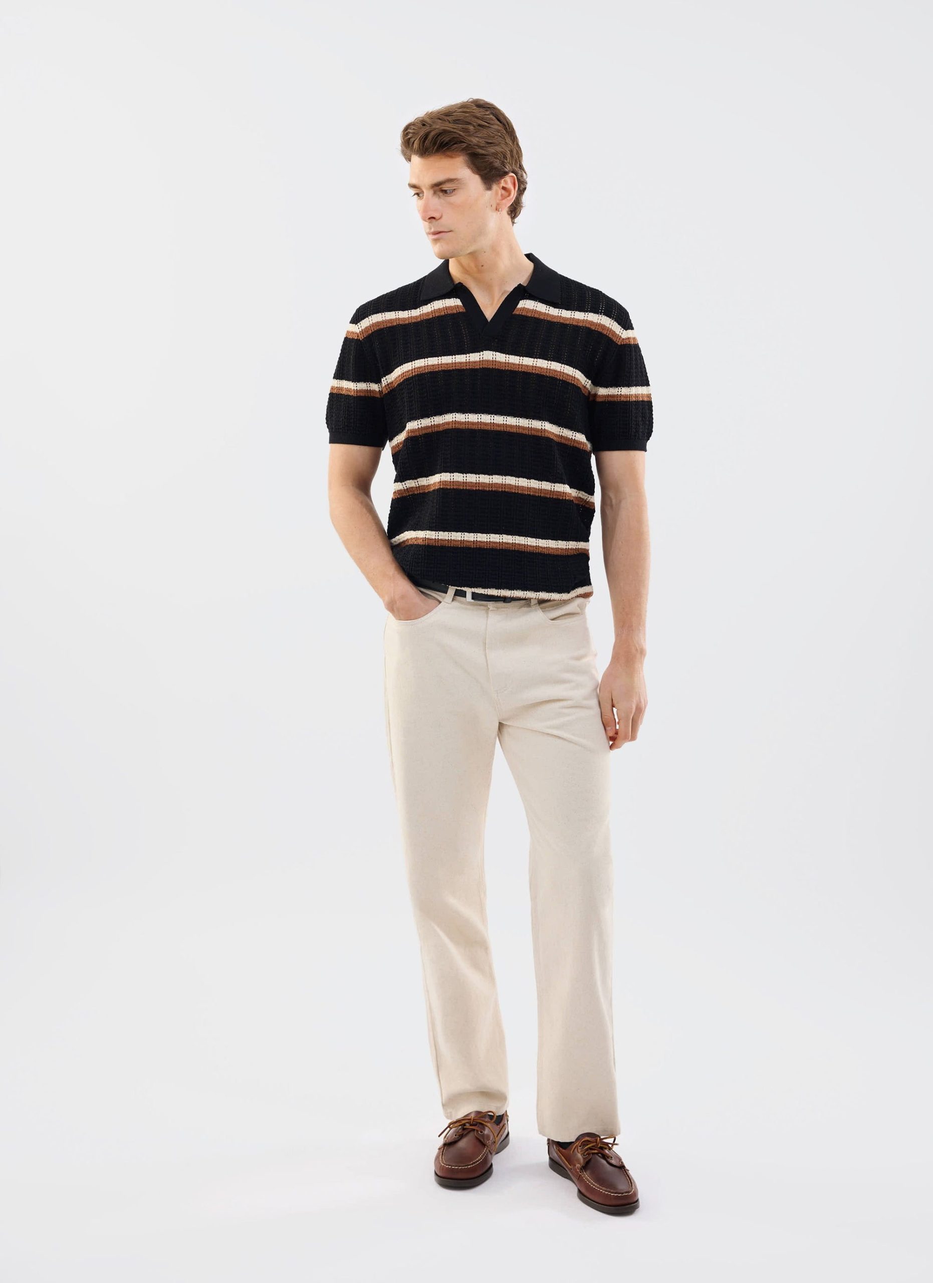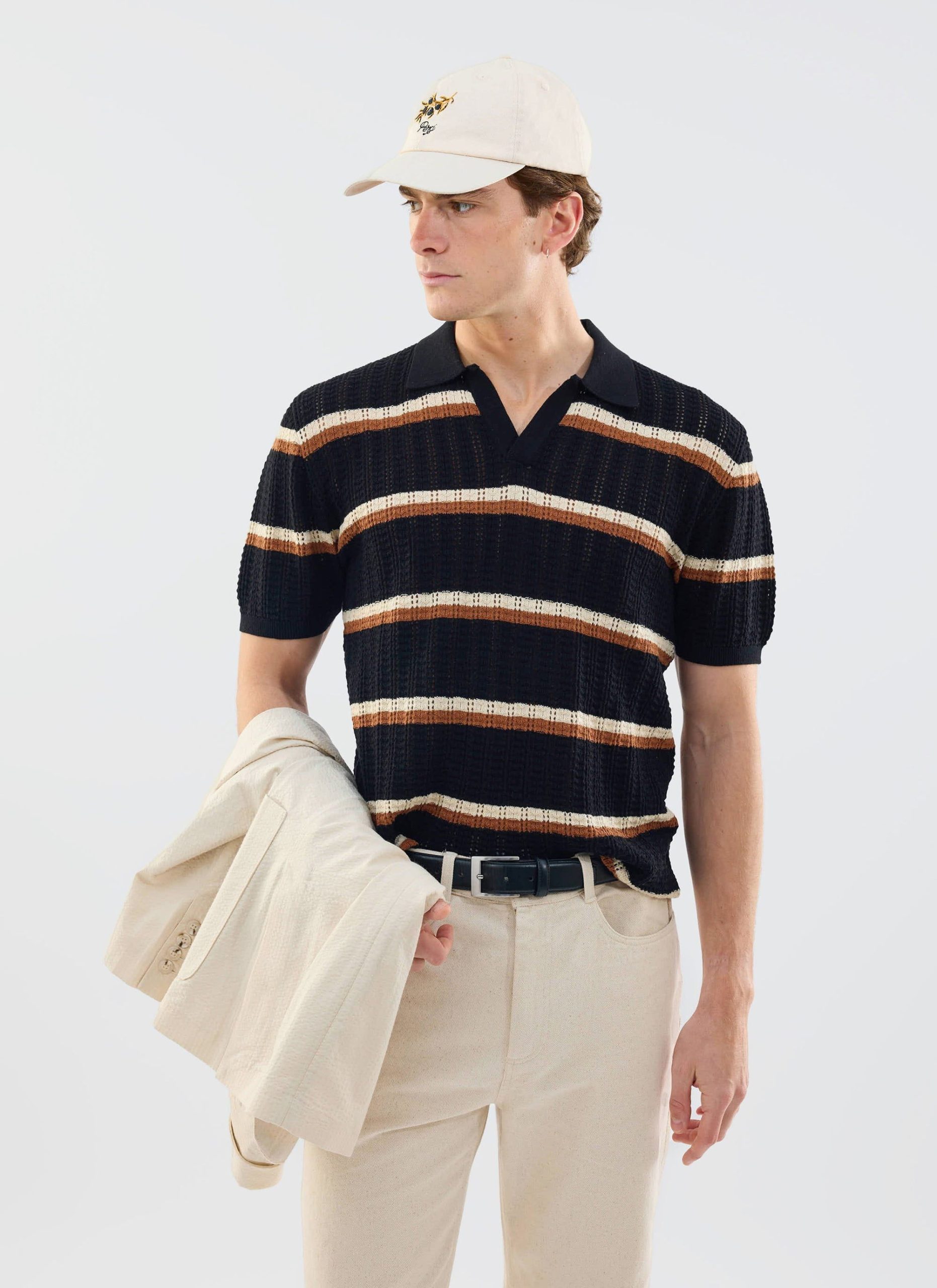 - Features: Men’s knitted polo shirt with an open collar, made from 100% organic cotton. Designed for a comfortable fit, this versatile polo is perfect for any occasion and pairs effortlessly with any outfit. A finely ribbed polo shirt with vertical cream stripes, featuring a ribbed collar, open placket, and ribbed arms, this polo is a must-have for men who appreciate effortless style.