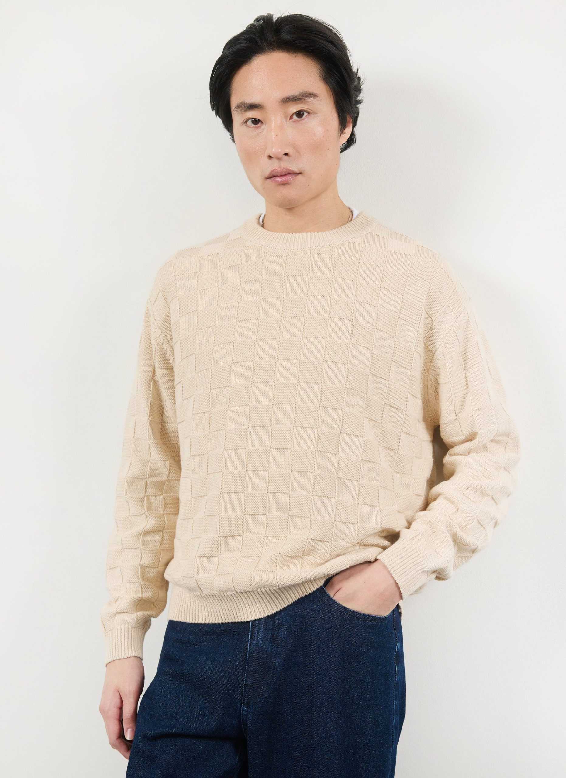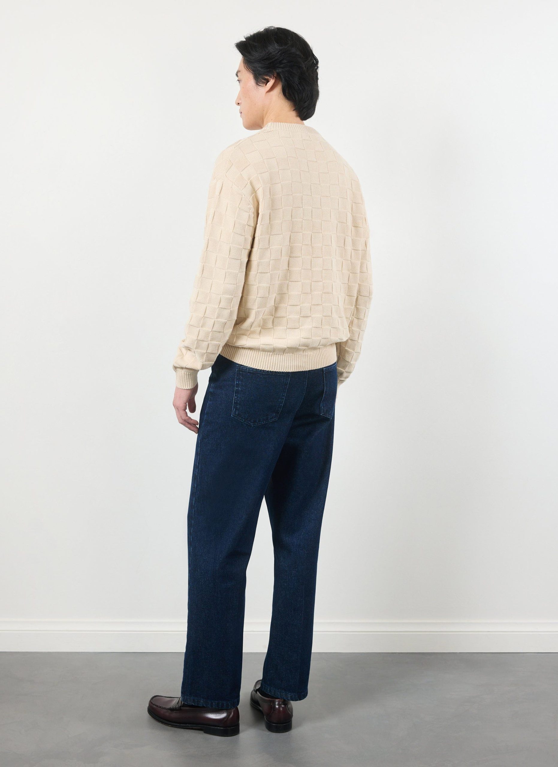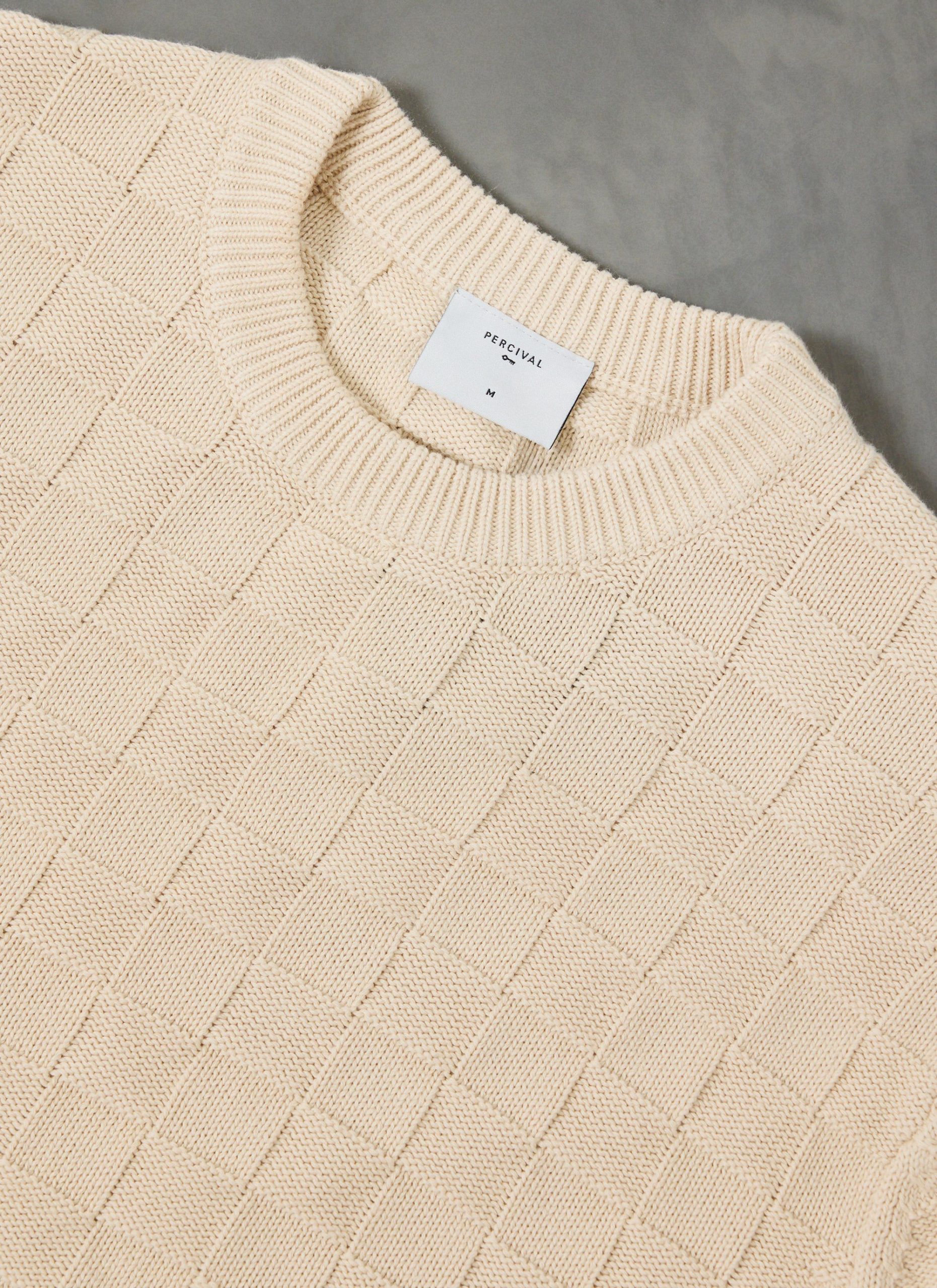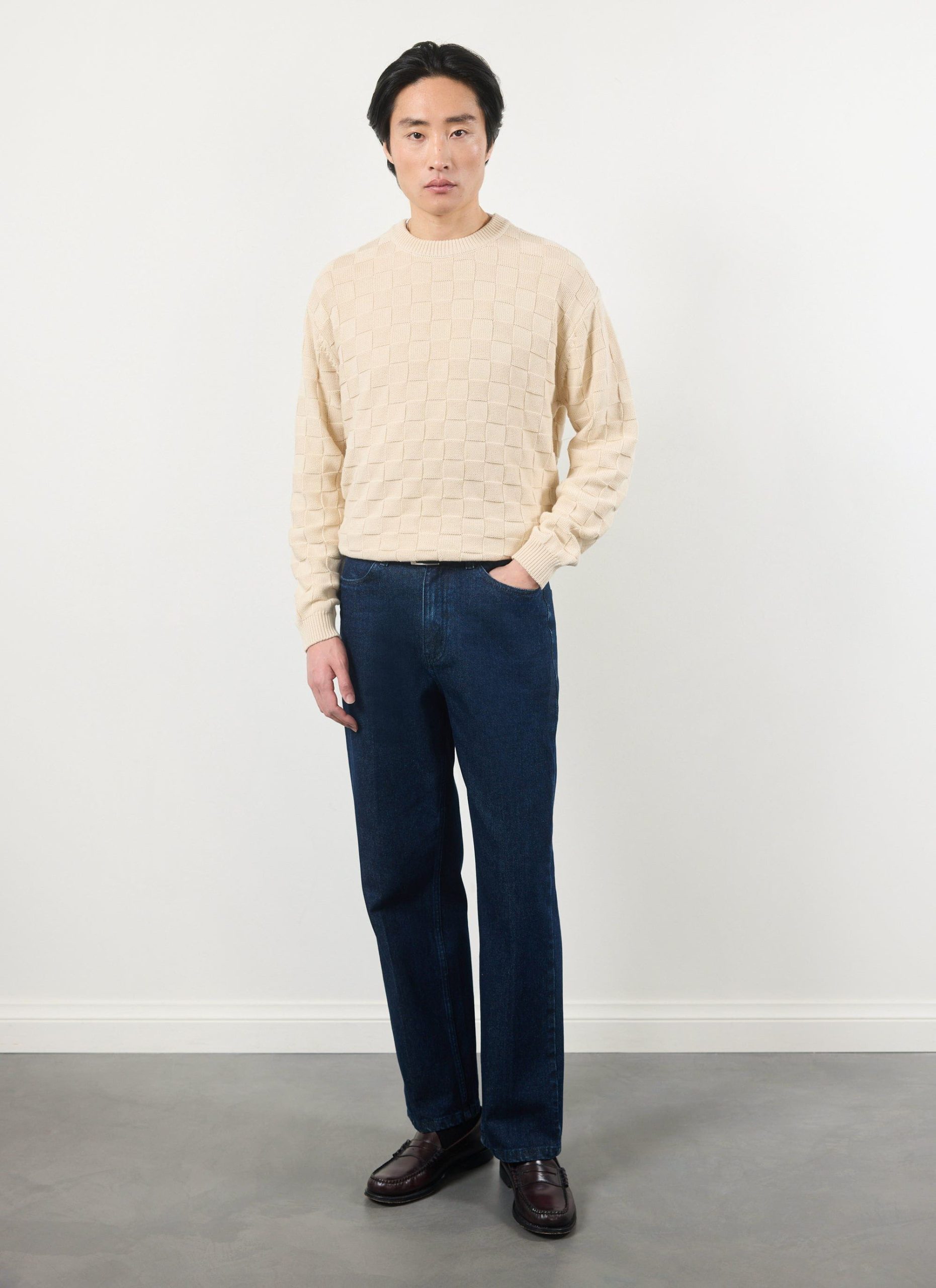 - Features: Men’s knitted jumper, textural weave, made in limited quantities, pairs well with Percival denim.