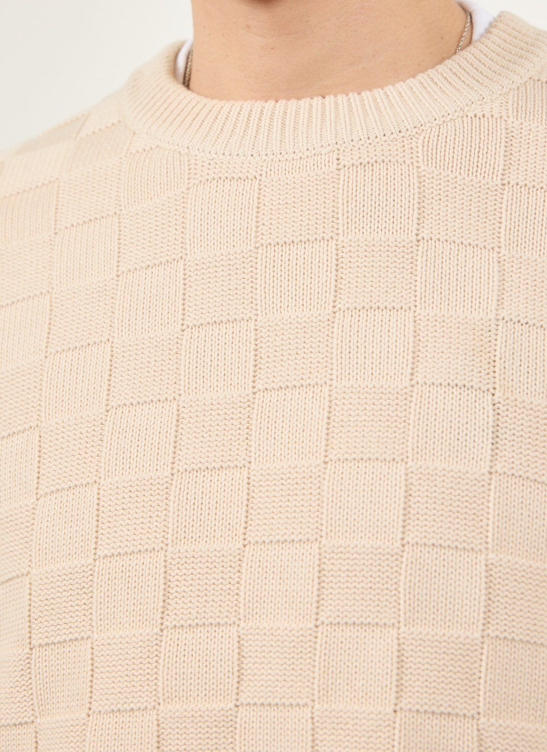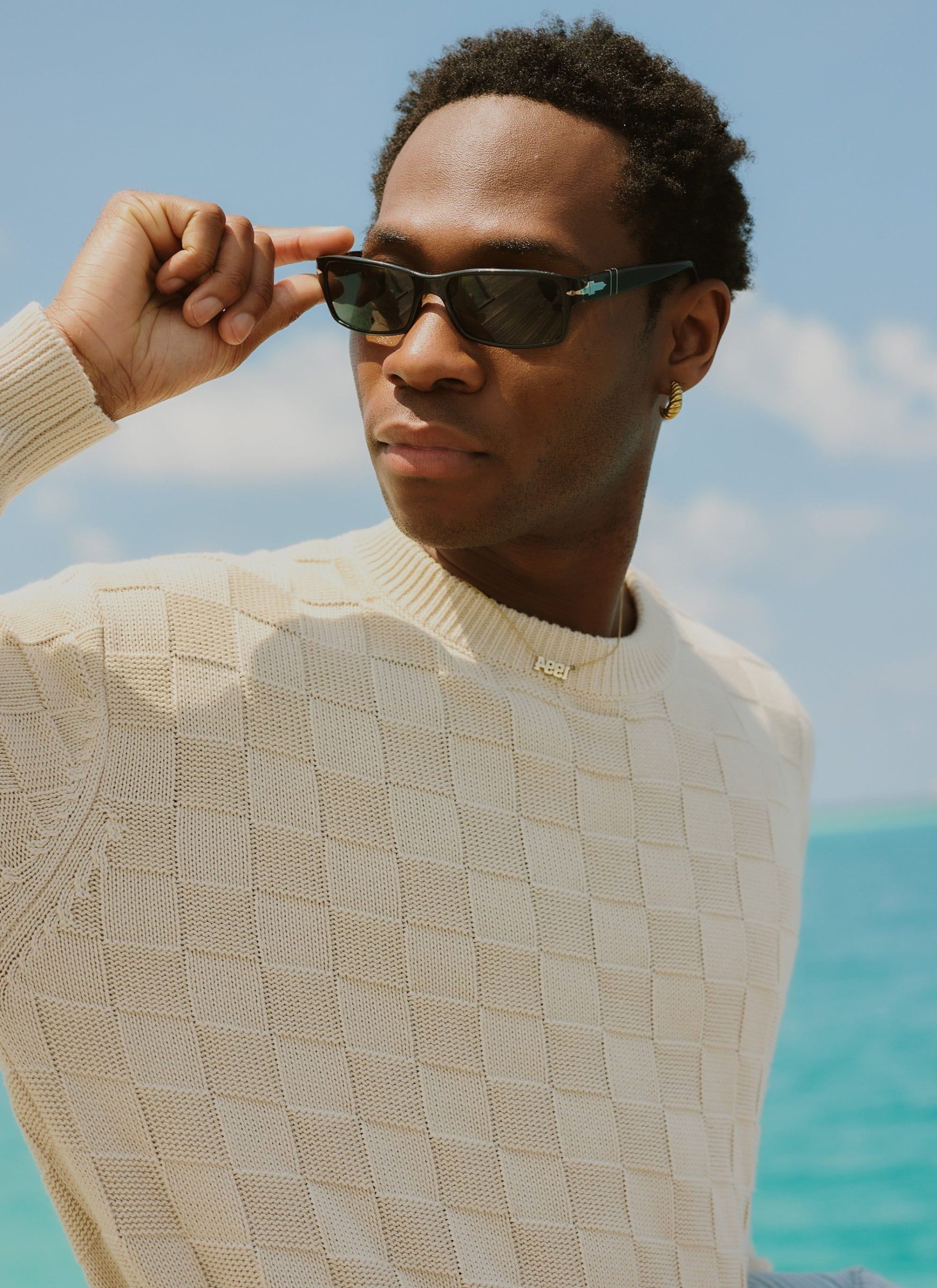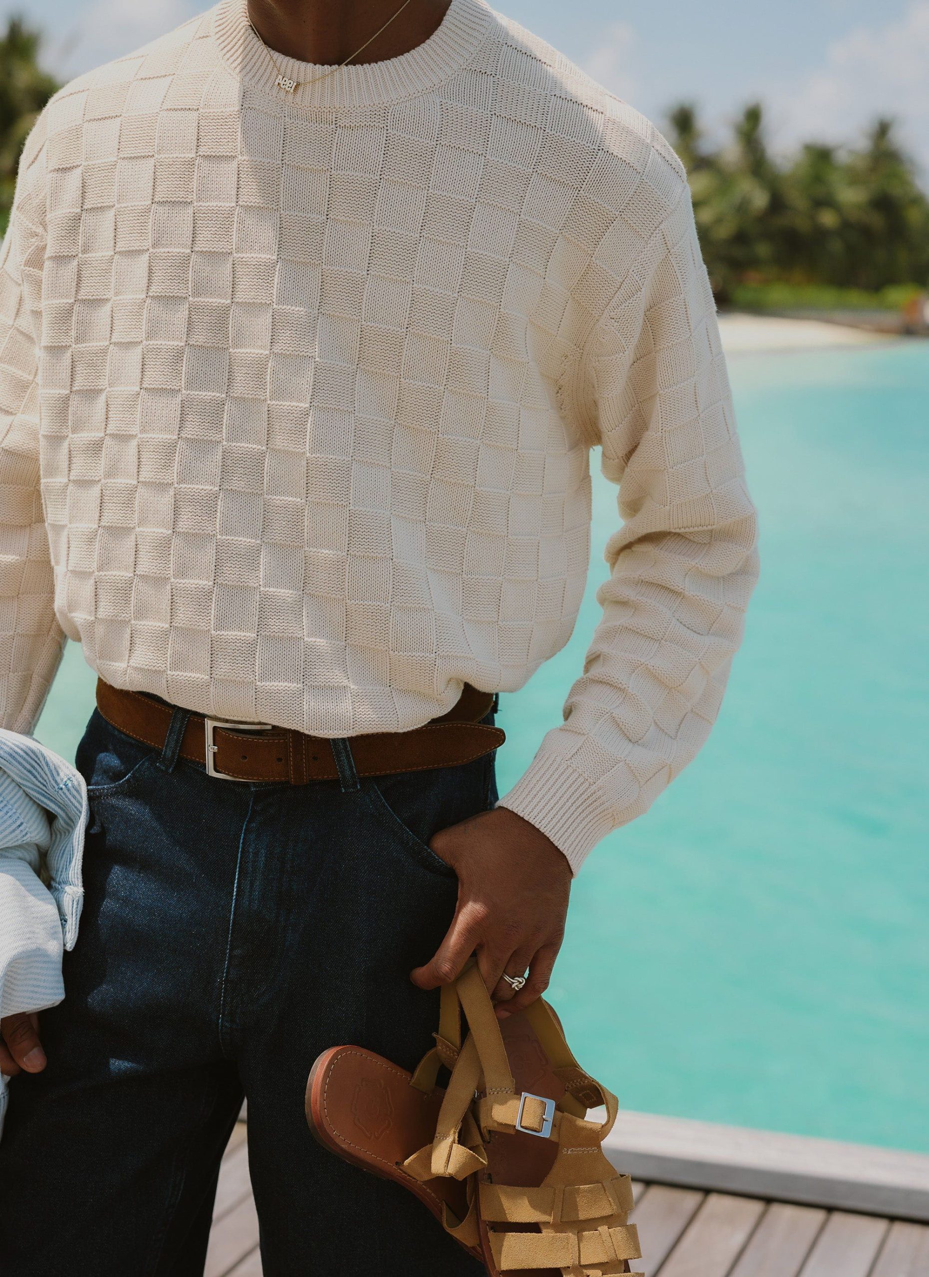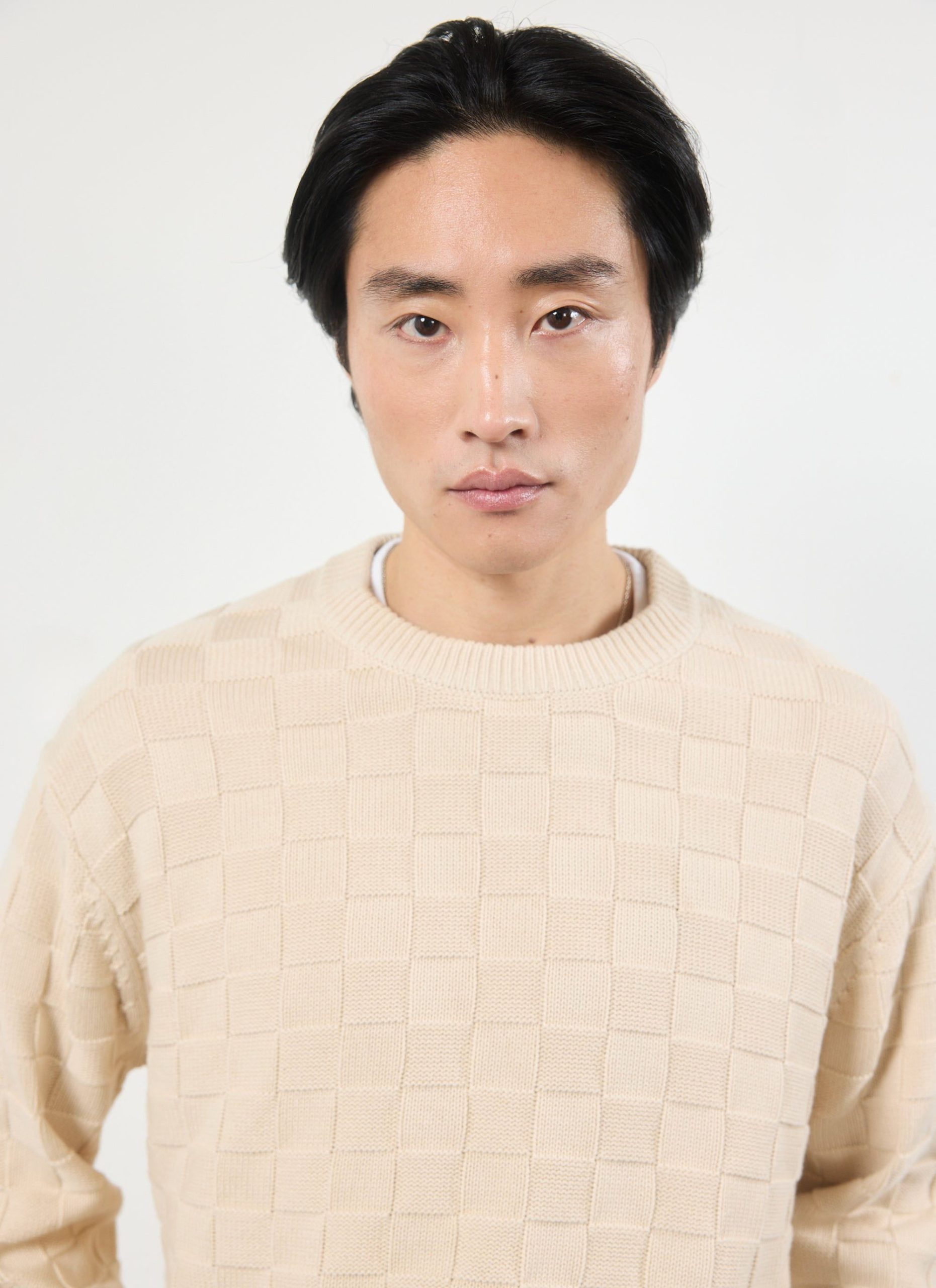- Features: Men’s knitted jumper, textural weave, made in limited quantities, pairs well with Percival denim.