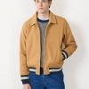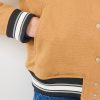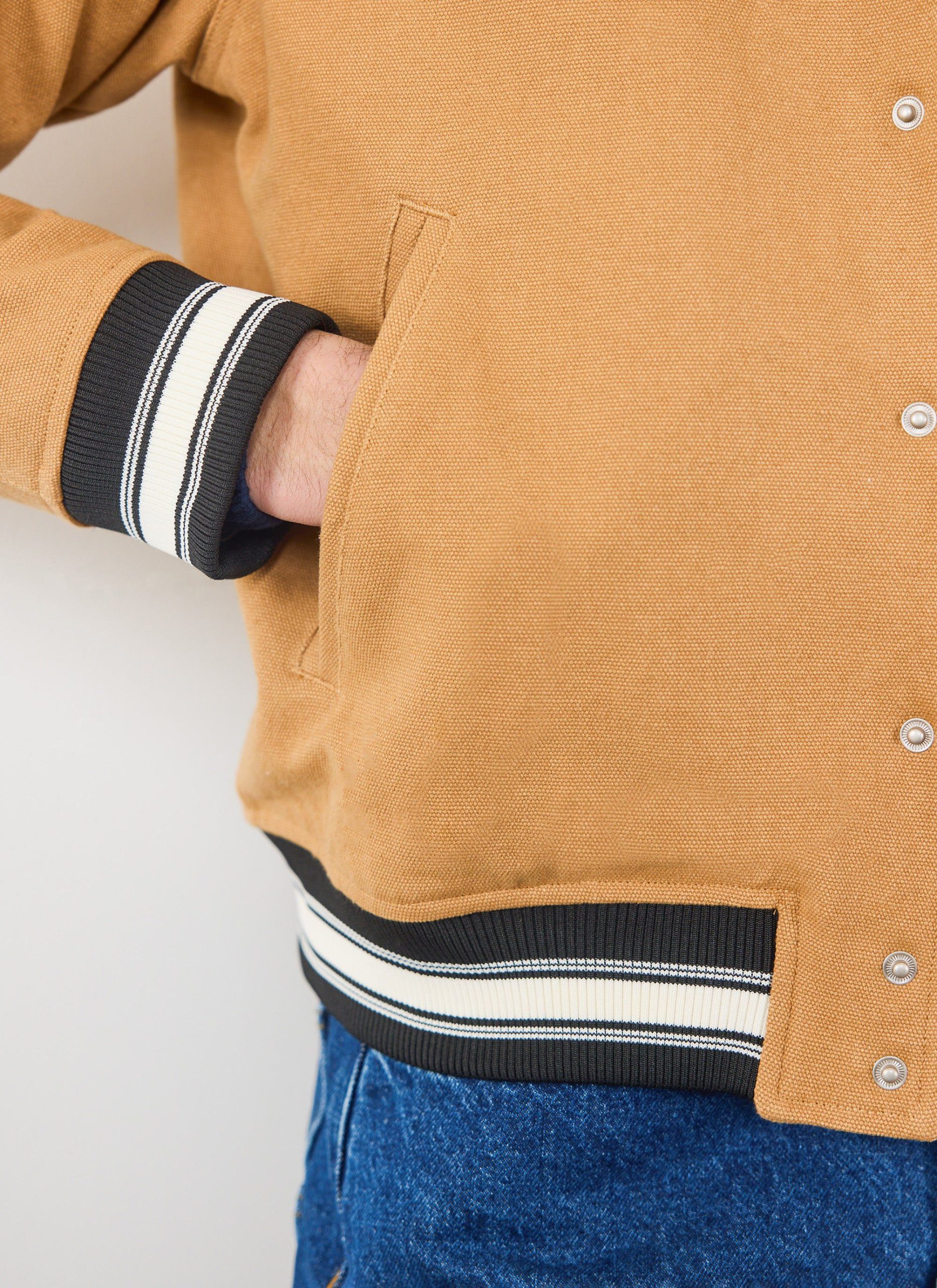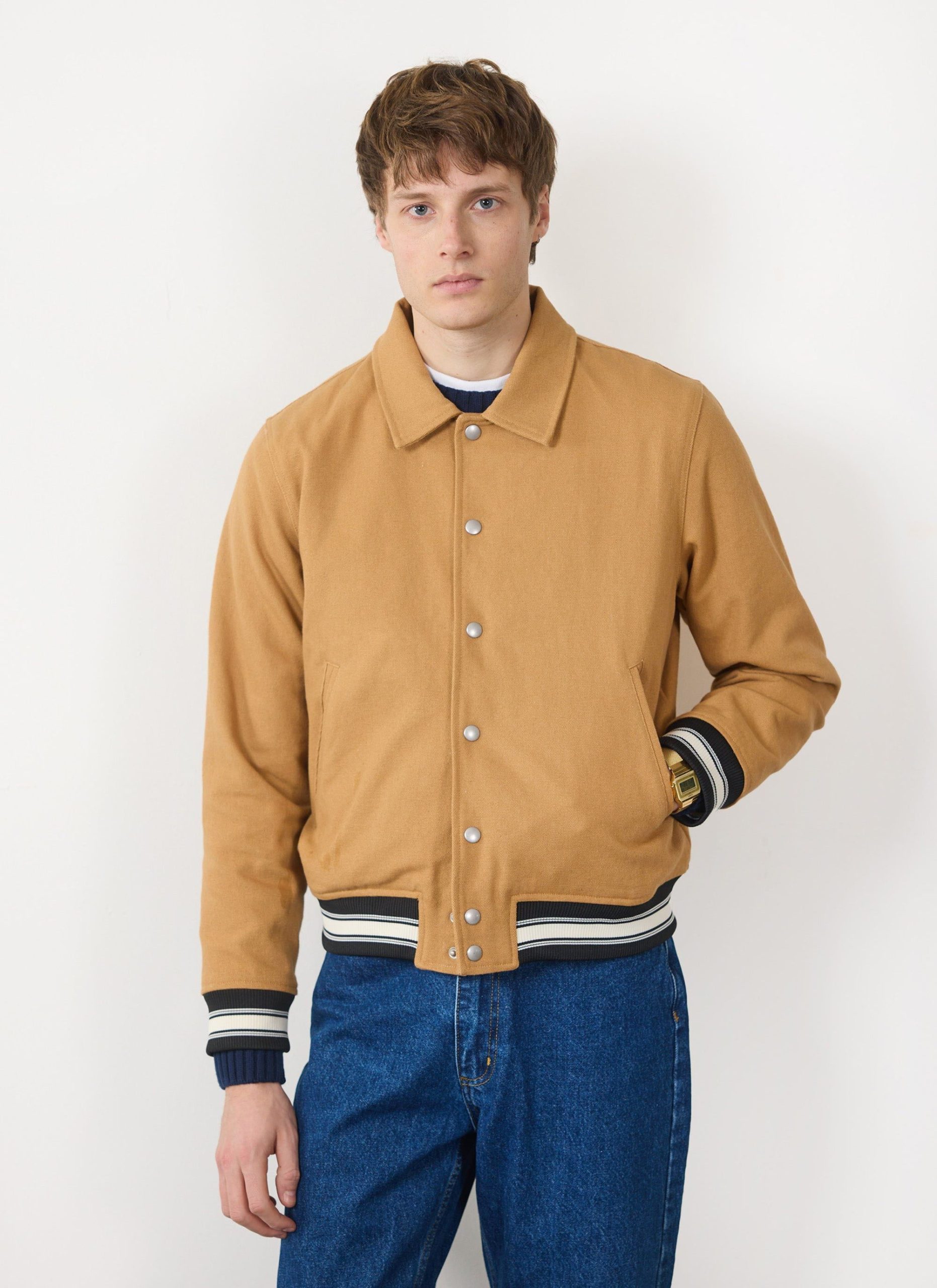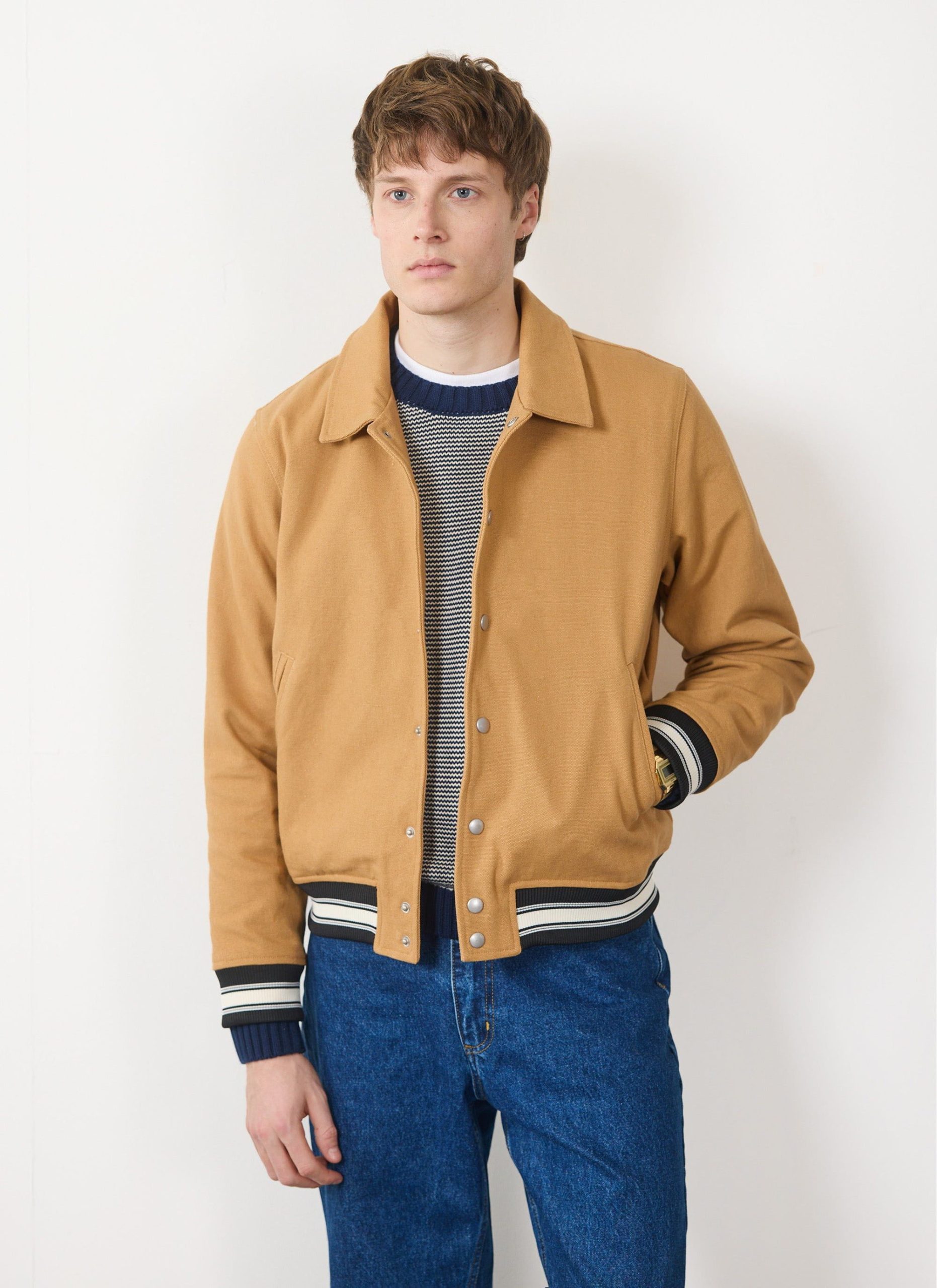 - Features: Men’s varsity bomber in tan, crafted from heavyweight cotton. Featuring silver snap fastenings, jetted welt pockets, and chunky rib detailing, this. bomber jacket from the Percival x Ilaria collection offers a relaxed yet stylish look with all-day comfort.