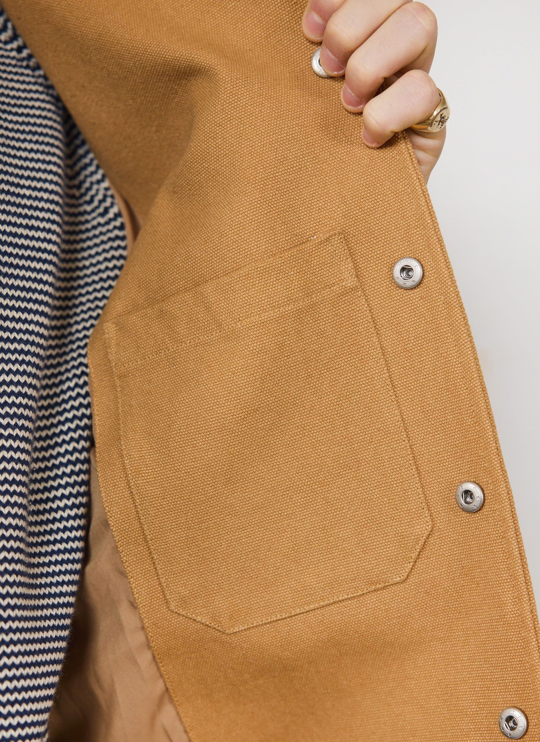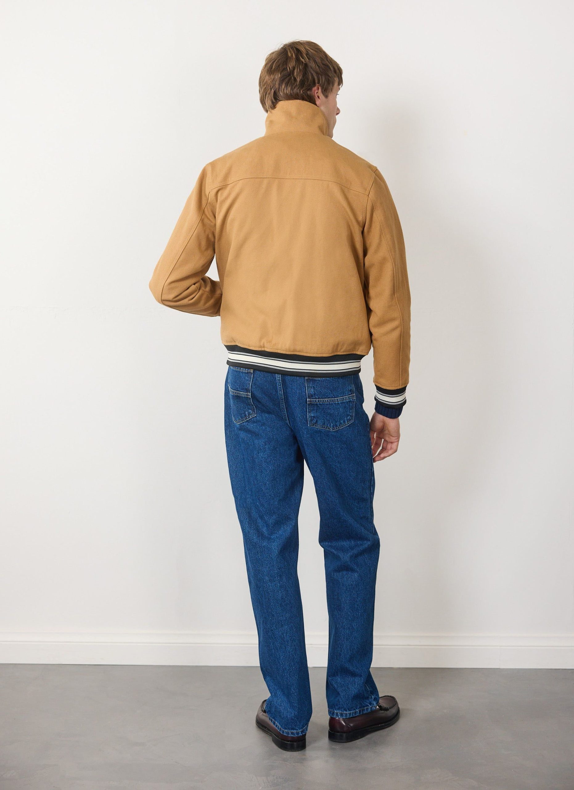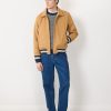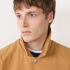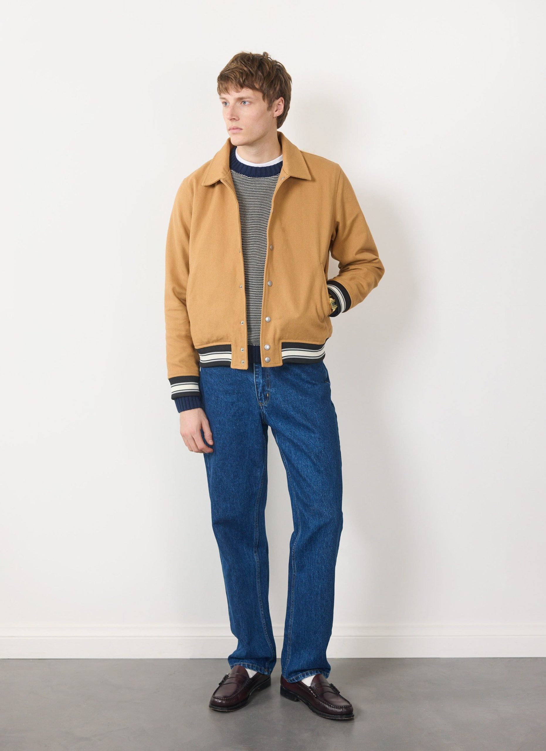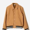 - Features: Men’s varsity bomber in tan, crafted from heavyweight cotton. Featuring silver snap fastenings, jetted welt pockets, and chunky rib detailing, this. bomber jacket from the Percival x Ilaria collection offers a relaxed yet stylish look with all-day comfort.