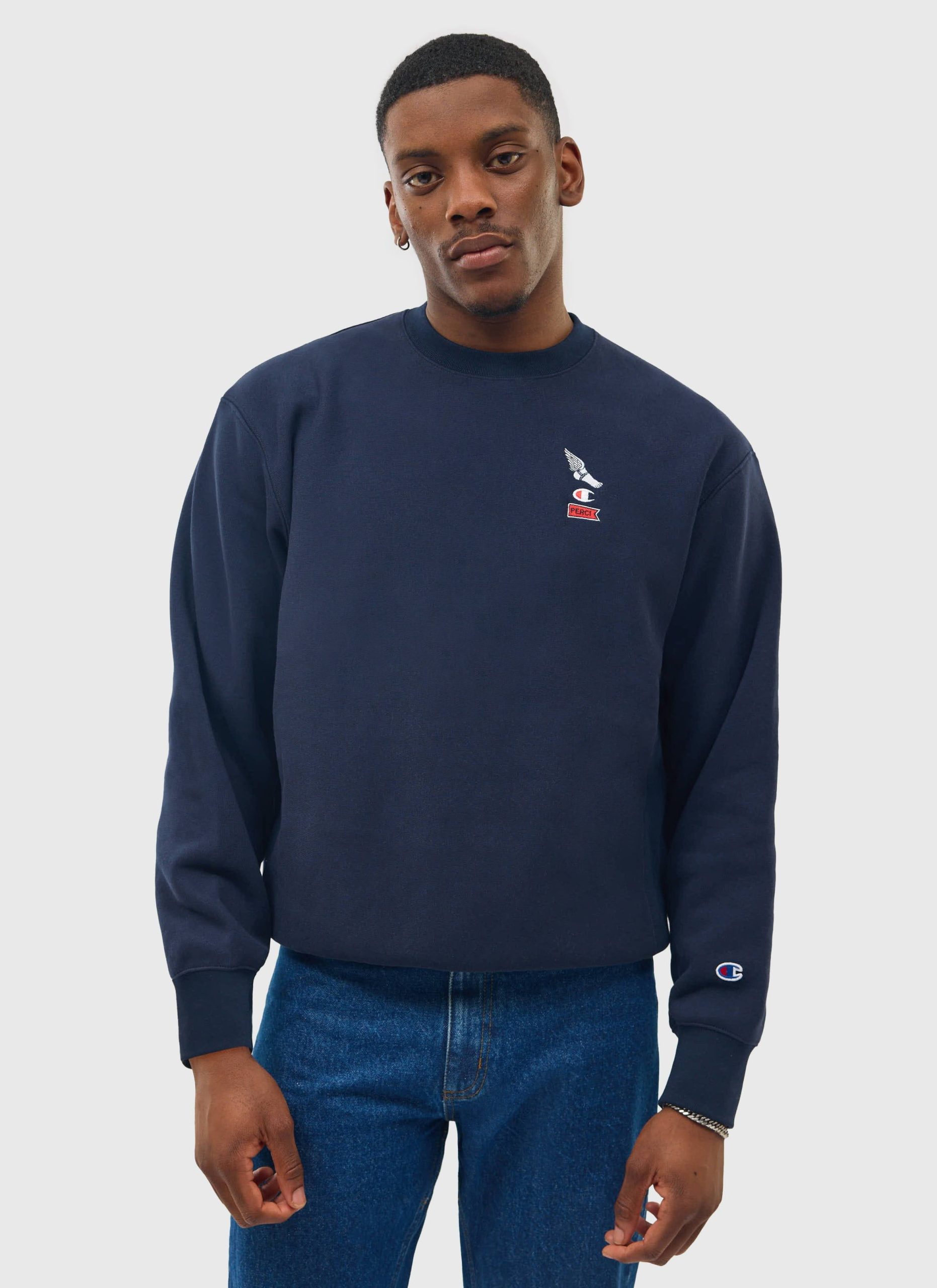 - Features: Men’s Reverse Weave Champion Sweatshirt in Navy. This Heavyweight Cotton Sweatshirt is embroidered in London with a hand drawn Percival illustration ‘Perci Wing’ and iconic C logo patch on the sleeve. The champion pullover sweatshirt is a regular fit and is perfect for transitional seasons.
