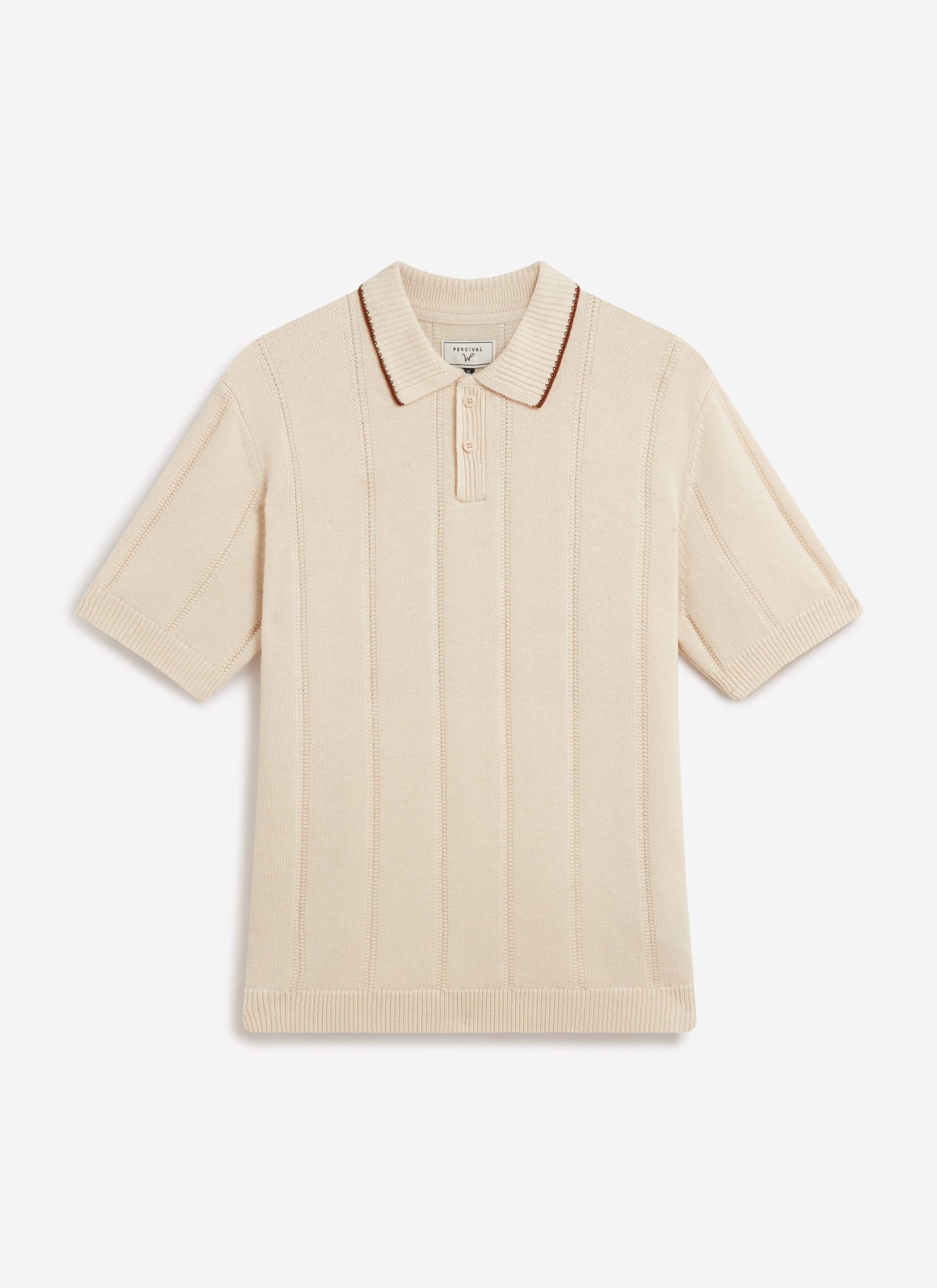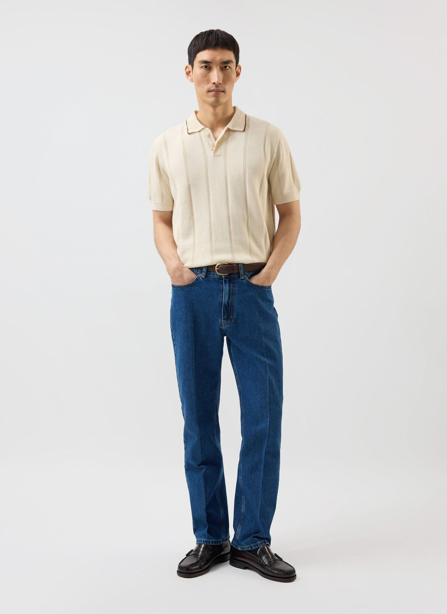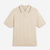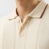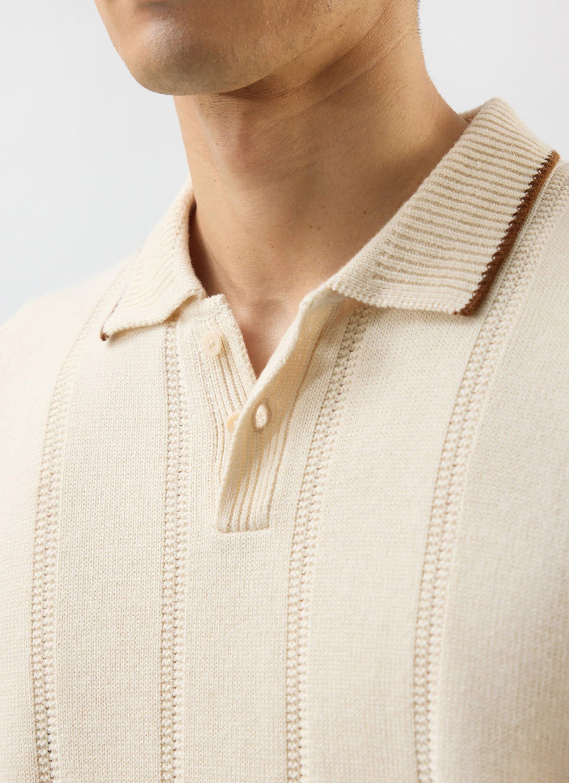 - Features: Men’s Knitted Polo Shirt in Ecru Cream, from the . Made from 100% cotton, this relaxed fit polo features vertical textured stripes, a ribbed collar, and refined detailing including a button down placket and subtle embroidered logo. Inspired by vintage polo styling, it’s a versatile piece ideal for the warmer months and transitions seamlessly into autumn.